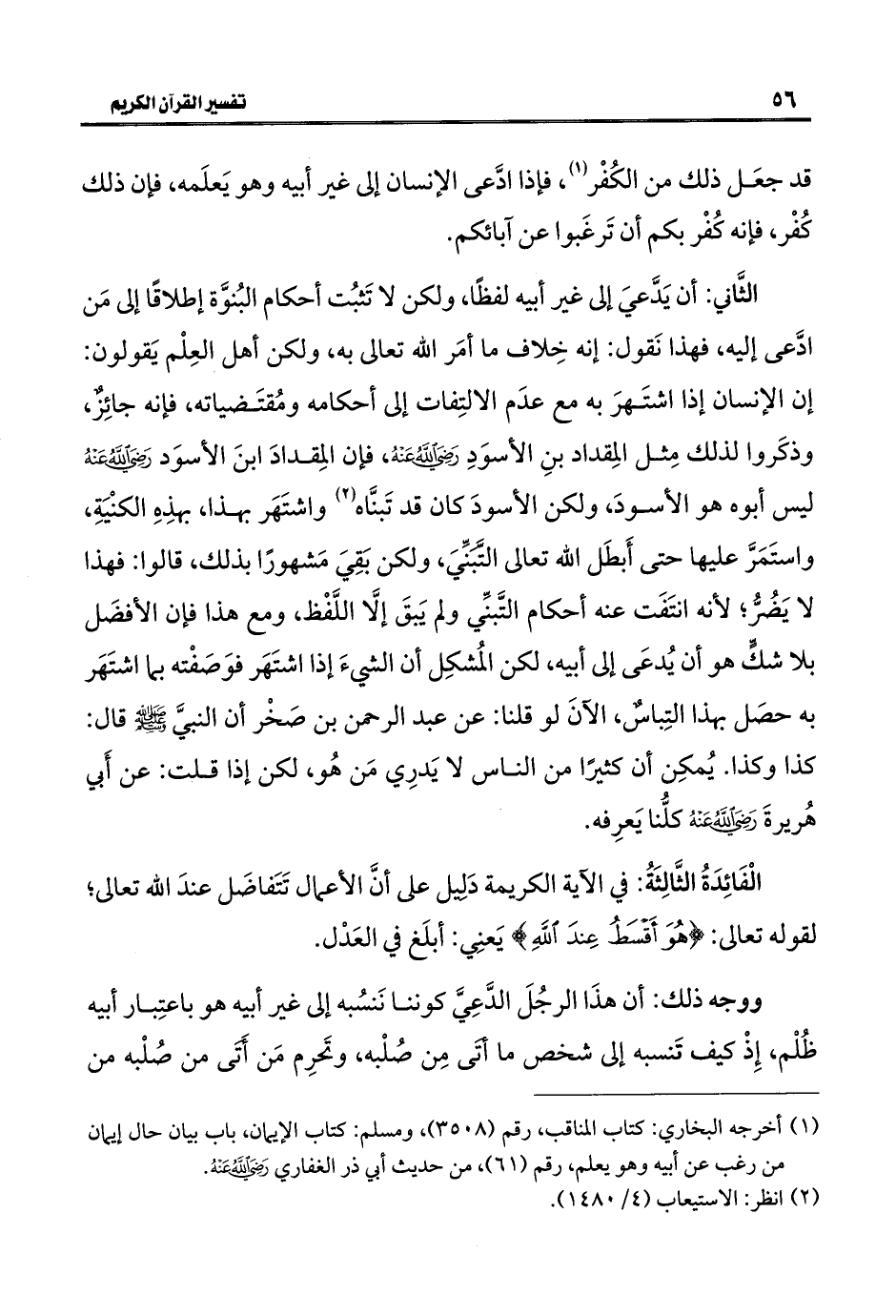 الثَّاني: أن يَدَّعيَ إلى غير أبيه لفظًا، ولكن لا تَثبُت أحكام البُنوَّة إطلاقًا إلى مَن ادَّعى إليه، فهذا نَقول: إنه خِلاف ما أمَر اللَّه تعالى به، ولكن أهل العِلْم يَقولون: إن الإنسان إذا اشتَهرَ به مع عدَم الالتِفات إلى أحكامه ومُقتَضياته، فإنه جائِزٌ، وذكَروا لذلك مِثل المِقداد بنِ الأسوَدِ -رضي اللَّه عنه-، فإن المِقدادَ ابنَ الأسوَد -رضي اللَّه عنه- ليس أَبوه هو الأسودَ، ولكن الأسودَ كان قد تَبنَّاه (¬٢) واشتَهَر بهذا، بهذ الكنْيَةِ، واستَمَرَّ عليها حتَّى أَبطَل اللَّه تعالى التَّبَنِّيَ، ولكن بَقِيَ مَشهورًا بذلك، قالوا: فهذا لا يَضُرُّ؛ لأنه انتَفَت عنه أحكام التَّبنِّي ولم يَبقَ إلَّا اللَّفْظ، ومع هذا فإن الأفضَل بلا شكٍّ هو أن يُدعَى إلى أبيه، لكن المُشكِل أن الشيءَ إذا اشتَهَر فوَصَفْته بما اشتَهَر به حصَل بهذا التِباسٌ، الآنَ لو قلنا: عن عبدِ الرحمن بنُ صَخْر أن النبيَّ -صلى اللَّه عليه وسلم- قال: كذا وكذا. يُمكِن أن كثيرًا من الناس لا يَدرِي مَن هُو، لكن إذا قلت: عن أَبي هُريرةَ -رضي اللَّه عنه- كلُّنا يَعرِفه.