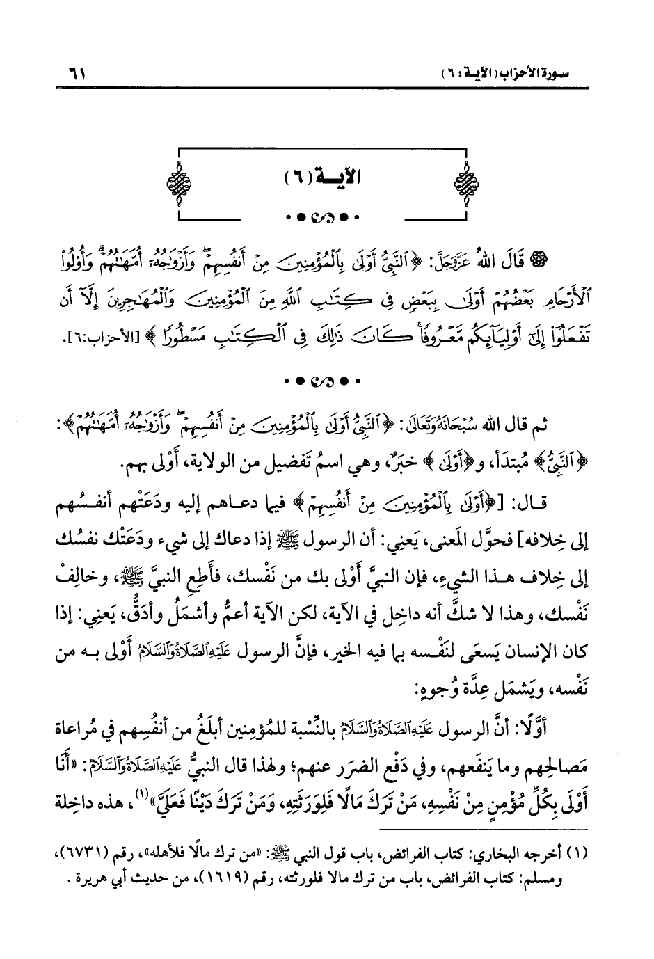 قال: [{أَوْلَى بِالْمُؤْمِنِينَ مِنْ أَنْفُسِهِمْ} فيما دعاهم إليه ودَعَتْهم أنفسُهم إلى خِلافه] فحوَّل المَعنى، يَعنِي: أن الرسول -صلى اللَّه عليه وسلم- إذا دعاك إلى شيء ودَعَتْك نفسُك إلى خِلاف هذا الشيءِ، فإن النبيَّ أَوْلى بك من نَفْسك، فأَطِعِ النبيَّ -صلى اللَّه عليه وسلم-، وخالِفْ نَفْسك، وهذا لا شكَّ أنَّه داخِل في الآية، لكن الآية أعمُّ وأشمَلُ وأدَقُّ، يَعنِي: إذا كان الإنسان يَسعَى لنَفْسه بي فيه الخير، فإنَّ الرسول عَلِيْهِ الصَّلَاةُ وَالسَّلَامُ أَوْلى به من نَفْسه، ويَشمَل عِدَّة وُجوهٍ: