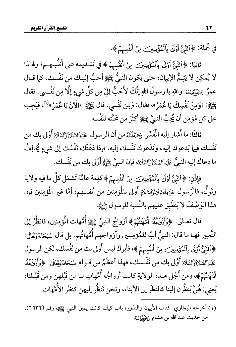 ثانيًا: {النَّبِيُّ أَوْلَى بِالْمُؤْمِنِينَ مِنْ أَنْفُسِهِمْ} في تَقديمه على أَنفُسِهم؛ ولهذا لا يُمكِن لا يَتِمُّ الإيمان؛ حتَّى يَكون النبيُّ -صلى اللَّه عليه وسلم- أحبَّ إليك من نَفْسك، كما قال عمرُ -رضي اللَّه عنه-: واللَّهِ يا رسولَ اللَّهِ إنَّكَ لأَحَبُّ إليَّ مِن كلِّ شيءٍ إلَّا مِن نَفْسي. فقال -صلى اللَّه عليه وسلم-: "وَمِنْ نَفْسِكَ يَا عُمَرُ"، فقال: وَمن نَفْسي. قال -صلى اللَّه عليه وسلم-: "الْآنَ يَا عُمَرُ" (¬١)، فيَجِب على كل مُؤمِن أن يُحِبَّ النبيَّ -صلى اللَّه عليه وسلم- أكثَرَ من مَحبَّته لنَفْسه.