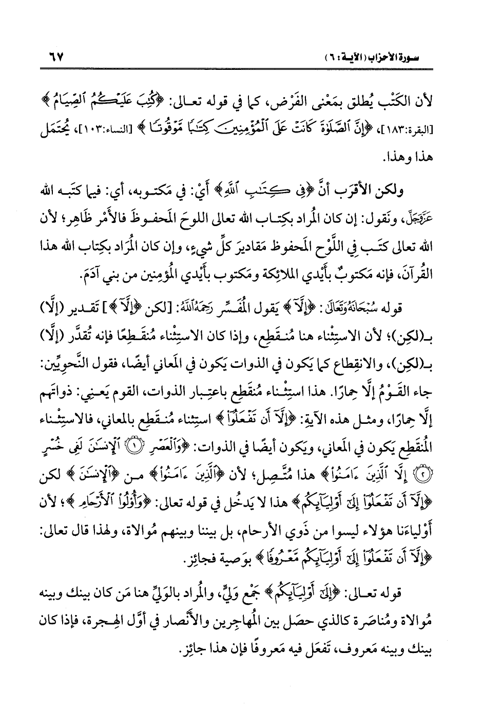 قوله سُبْحَانَهُ وَتَعَالَى: {إِلَّا} يَقول المُفَسِّر رَحِمَهُ اللَّهُ: [{لكنْ {إِلَّا}] تَقدير (إلَّا) بـ (لكِن)؛ لأن الاستِثْناء هنا مُنقَطِع، وإذا كان الاستِثْناء مُنقَطِعًا فإنه تُقدَّر (إلَّا) بـ (لكِن)، والانقِطاع كما يَكون في الذوات يَكون في المَعاني أيضًا، فقول النَّحوِيِّين: جاء القَوْمُ إلَّا حِمارًا. هذا استِثْناء مُنقَطِع باعتِبار الذوات، القوم يَعنِي: ذواتَهم إلَّا حِمارًا، ومثل هذه الآيةِ: {إِلَّا أَنْ تَفْعَلُوا} استِثناء مُنقَطِع بالمعاني، فالاستِثْنَاء المُنقَطِع يَكون في المَعاني، ويَكون أيضًا في الذوات: {وَالْعَصْرِ (١) إِنَّ الْإِنْسَانَ لَفِي خُسْرٍ (٢) إِلَّا الَّذِينَ آمَنُوا} هذا مُتَّصِل؛ لأن {الَّذِينَ آمَنُوا} من {الْإِنْسَانَ} لكن {إِلَّا أَنْ تَفْعَلُوا إِلَى أَوْلِيَائِكُمْ} هذا لا يَدخُل في قوله تعالى: {وَأُولُو الْأَرْحَامِ}؛ لأن أَوْلياءَنا هؤلاء ليسوا من ذَوي الأرحام، بل بيننا وبينهم مُوالاة، ولهذا قال تعالى: {إِلَّا أَنْ تَفْعَلُوا إِلَى أَوْلِيَائِكُمْ مَعْرُوفًا} بوَصية فجائِز.