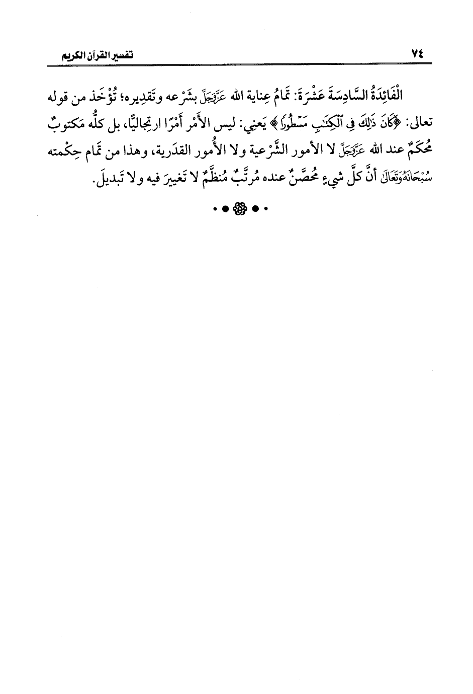الْفَائِدَةُ السَّادِسَةَ عَشْرَةَ: تَمامُ عِناية اللَّه عَزَّ وَجَلَّ بشَرْعه وتَقدِيره؛ تُؤْخَذ من قوله تعالى: {كَانَ ذَلِكَ فِي الْكِتَابِ مَسْطُورًا} يَعنِي: ليس الأَمْر أَمْرًا ارتِجاليًّا، بل كلُّه مَكتوبٌ محُكَمٌ عند اللَّه عَزَّ وَجَلَّ لا الأمور الشَّرْعية ولا الأُمور القدَرية، وهذا من تَمام حِكْمته سُبْحَانَهُ وَتَعَالَى أنَّ كلَّ شيءٍ محُصَّنٌ عنده مُرتَّبٌ مُنظَّمٌ لا تَغييرَ فيه ولا تَبديلَ.