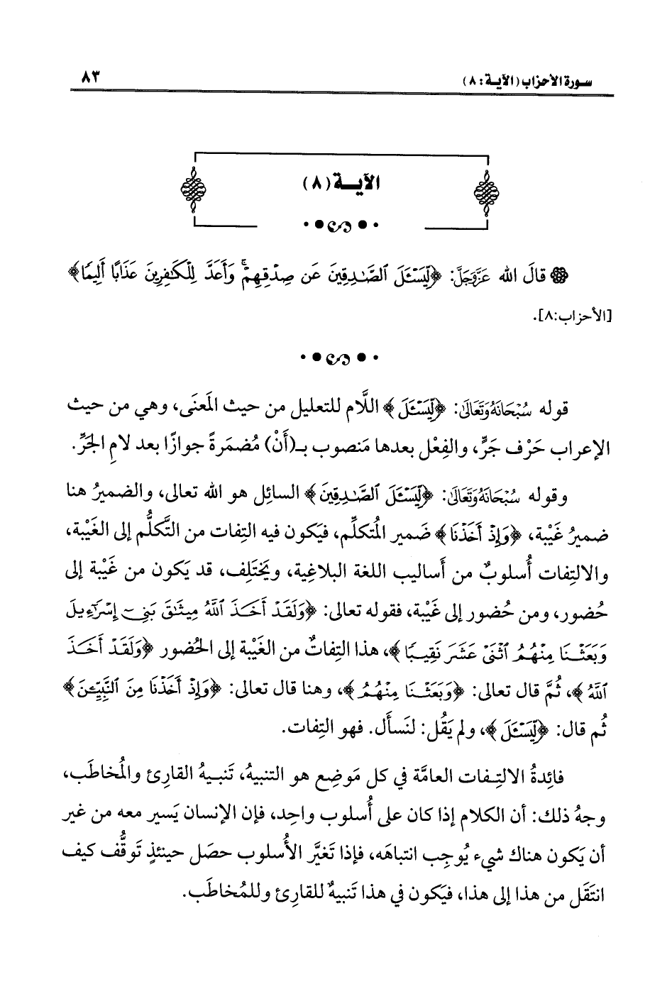 وقوله سُبْحَانَهُ وَتَعَالَى: {لِيَسْأَلَ الصَّادِقِينَ} السائِل هو اللَّه تعالى، والضميرُ هنا ضميرُ غَيْبة، {وَإِذْ أَخَذْنَا} ضَمير المُتكلِّم، فيَكون فيه التِفات من التَّكلُّم إلى الغَيْبة، والالتِفات أُسلوبٌ من أَساليب اللغة البلاغِية، ويَختَلِف، قد يَكون من غَيْبة إلى حُضور، ومن حُضور إلى غَيْبة، فقوله تعالى: {وَلَقَدْ أَخَذَ اللَّهُ مِيثَاقَ بَنِي إِسْرَائِيلَ وَبَعَثْنَا مِنْهُمُ اثْنَيْ عَشَرَ نَقِيبًا}، هذا التِفات من الغَيْبة إلى الحُضور {وَلَقَدْ أَخَذَ اللَّهُ}، ثُمَّ قال تعالى: {وَبَعَثْنَا مِنْهُمُ}، وهنا قال تعالى: {وَإِذْ أَخَذْنَا مِنَ النَّبِيِّينَ} ثُم قال: {لِيَسْأَلَ}، ولم يَقُل: لنَسأَل. فهو التِفات.