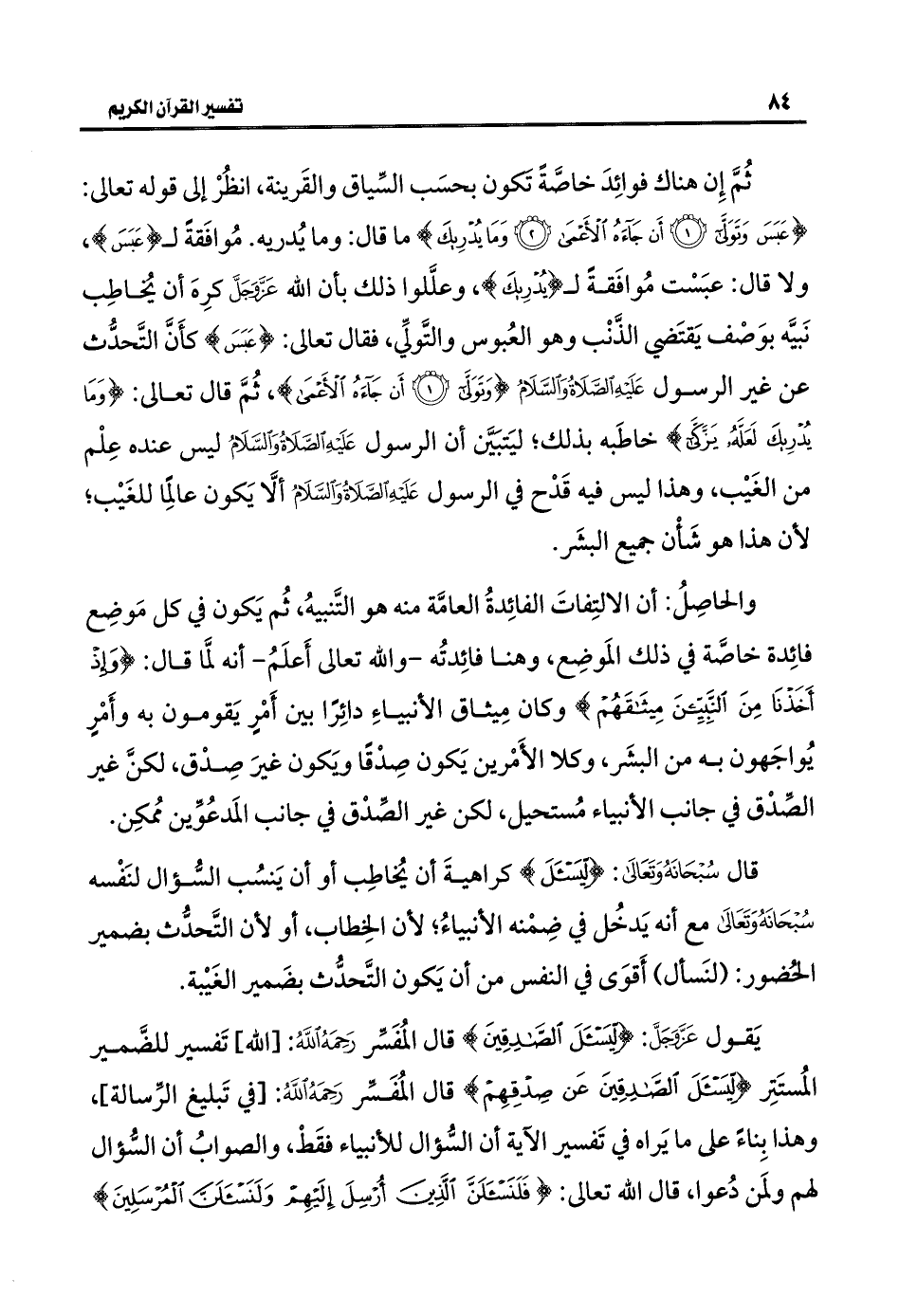 ثُمَّ إِن هناك فوائِدَ خاصَّةً تَكُون بحسَب السِّياق والقَرينة، انظُرْ إلى قوله تعالى: {عَبَسَ وَتَوَلَّى (١) أَنْ جَاءَهُ الْأَعْمَى (٢) وَمَا يُدْرِيكَ} ما قال: وما يُدريه. مُوافَقةً لـ {عَبَسَ}، ولا قال: عبَسْت مُوافَقةً لـ {يُدْرِيكَ}، وعلَّلوا ذلك بأن اللَّه عَزَّ وَجَلَّ كرِهَ أن يُخَاطِب نَبيَّه بوَصْف يَقتَضي الذَّنْب وهو العُبوس والتَّولِّي، فقال تعالى: {عَبَسَ} كأَنَّ التَّحدُّث عن غير الرسول عَلَيْهِ الصَّلَاةُ وَالسَّلَامُ {وَتَوَلَّى (١) أَنْ جَاءَهُ الْأَعْمَى}، ثُمَّ قال تعالى: {وَمَا يُدْرِيكَ لَعَلَّهُ يَزَّكَّى} خاطَبه بذلك؛ ليَتبَيَّن أن الرسول عَلَيْهِ الصَّلَاةُ وَالسَّلَامُ ليس عنده عِلْم من الغَيْب، وهذا ليس فيه قَدْح في الرسول عَلَيْهِ الصَّلَاةُ وَالسَّلَامُ ألَّا يَكون عالمًا للغَيْب؛ لأن هذا هو شَأْن جميع البشَر.