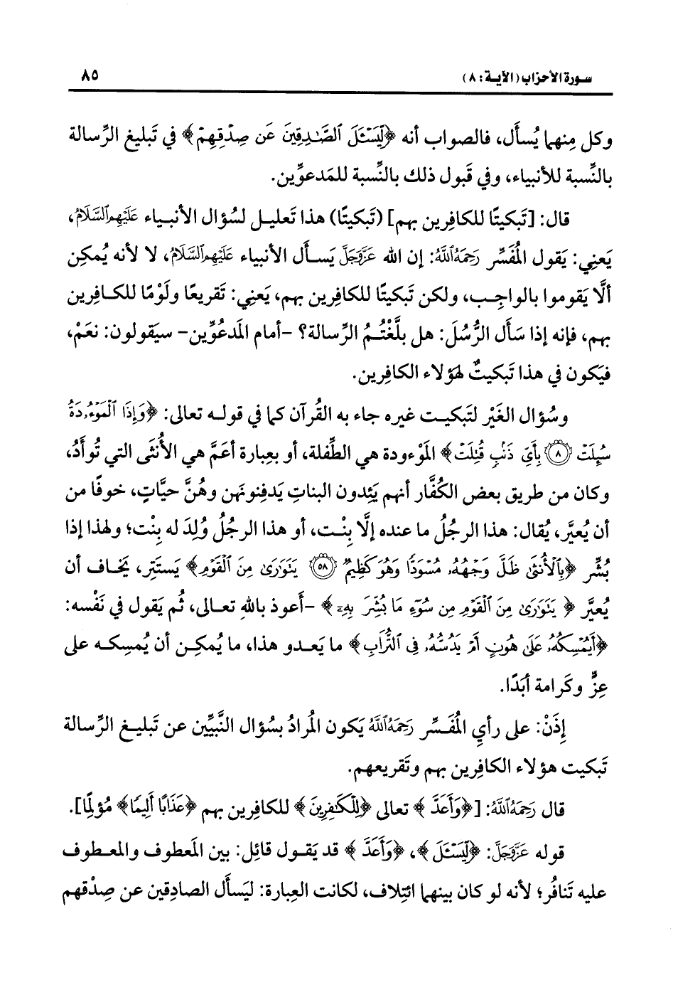 قال: [تَبكيتًا للكافِرين بهم] (تَبكيتًا) هذا تَعليل لسُؤال الأنبياء عليهم السَّلَامُ، يَعنِي: يَقول المُفَسِّر رَحِمَهُ اللَّهُ: إنَّ اللَّه عَزَّ وَجَلَّ يَسأَل الأنبياء عليهم السَّلَامُ، لا لأنه يُمكِن ألَّا يَقوموا بالواجِب، ولكن تَبكيتًا للكافِرين بهم، يَعنِي: تَقريعًا ولَوْمًا للكافِرين بهم، فإنه إذا سَأَل الرُّسُلَ: هل بلَّغْتُمُ الرِّسالة؟ -أمام المَدعُوِّين- سيَقولون: نعَمْ، فيَكون في هذا تَبكيتٌ لِهَولاء الكافِرين.