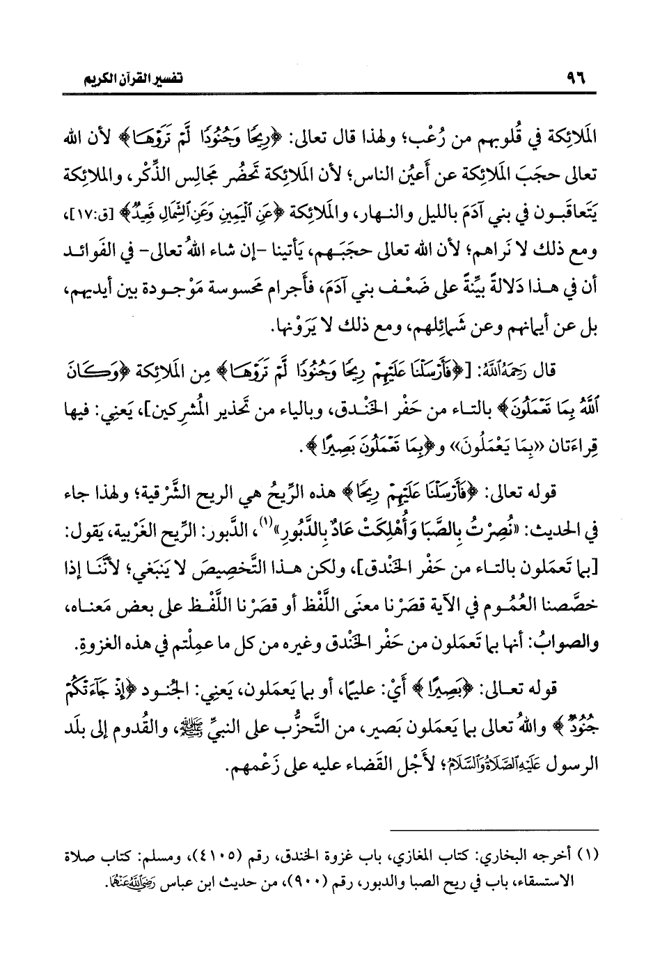 قال رَحِمَهُ اللَّهُ: [{فَأَرْسَلْنَا عَلَيْهِمْ رِيحًا وَجُنُودًا لَمْ تَرَوْهَا} مِن المَلائِكة {وَكَانَ اللَّهُ بِمَا تَعْمَلُونَ} بالتاء من حَفْر الخَنْدق، وبالياء من تَحذير المُشرِكين] يَعنِي: فيها قِراءَتان "بِمَا يَعْمَلُونَ" و {بِمَا تَعْمَلُونَ بَصِيرًا}.