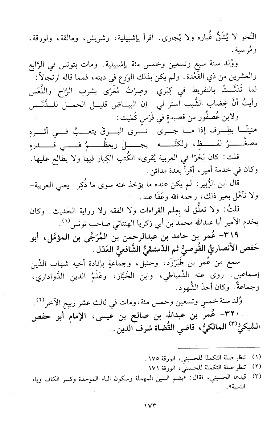 320 - عمر بن عبد الله بن صالح بن عيسى، الإمام، أبو حفص السُّبْكيّ، المالكي، قاضي القُضاة شرف الدّين. [المتوفى: 669 هـ]-[174]-