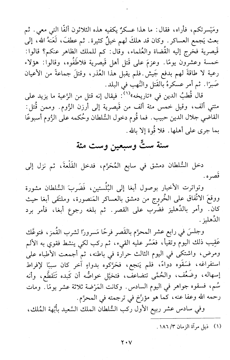 دخل السّلطان دمشق فِي سابع المحرَّم، فدخل القلعة، ثم نزل إلى قصره.