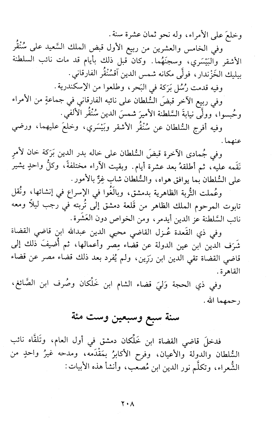 فدخل قاضي القضاة ابن خَلِّكان دمشق فِي أول العام وتلقّاه نائب السّلطان والدولة والأعيان، وفرح الأكابر بمَقْدَمِه ومدحه غيرُ واحدٍ من الشعراء، وتكلم نور الدين ابن مُصْعَب وأنشأ هَذِهِ الأبيات: -[209]-