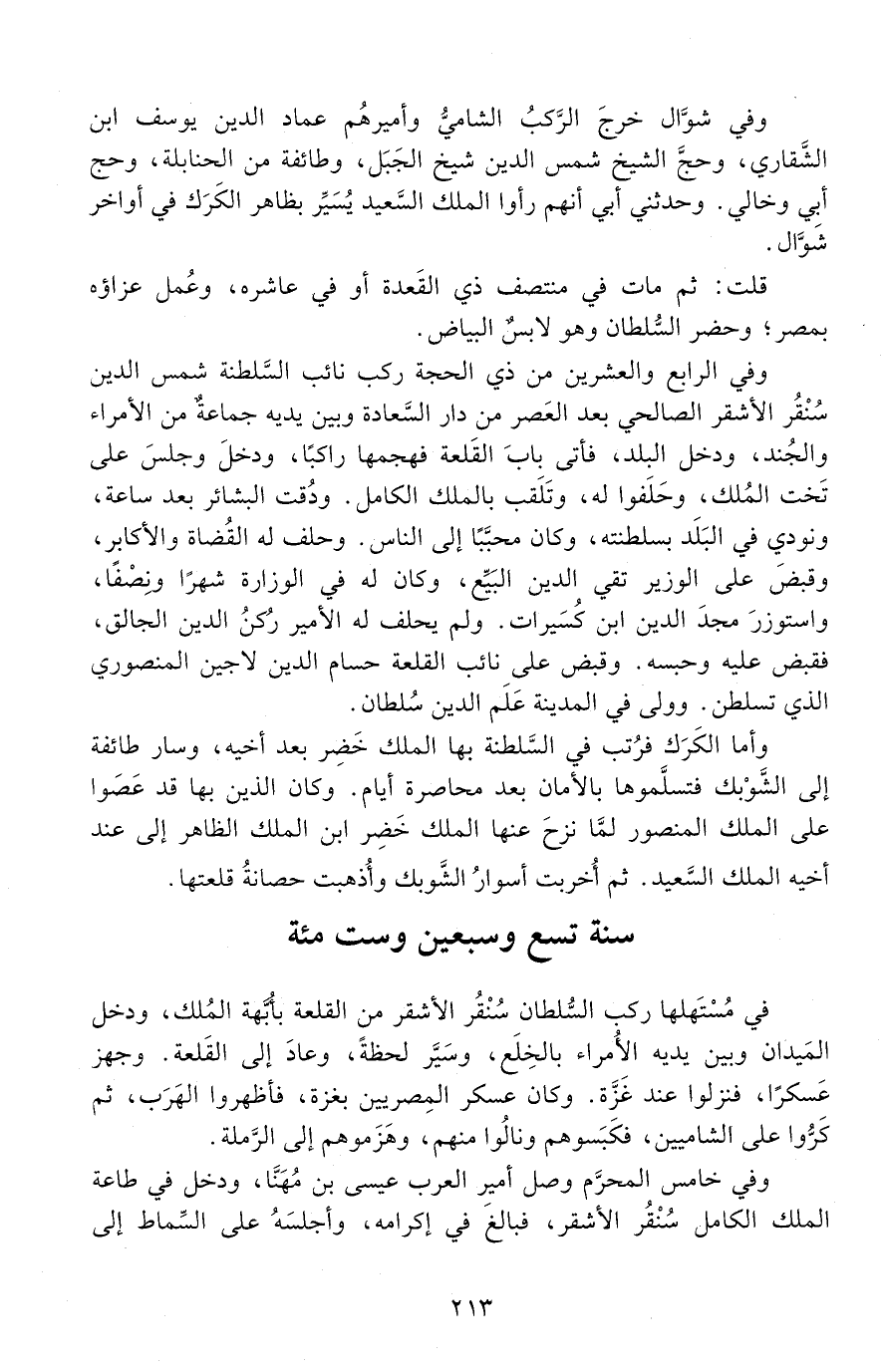 وَفِي خامس المحرَّم وصل أمير العرب عِيسَى بْن مُهَنّا، ودخل فِي طاعة الملك الكامل سُنْقر الأشقر، فبالغ فِي إكرامه، وأجلسه على السماط إلى -[214]-