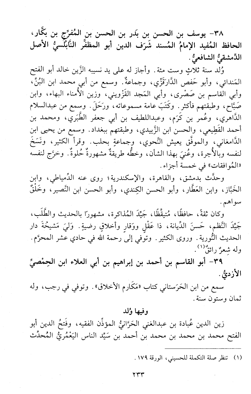 38 - يوسف بْن الْحَسَن بْن بدْر بْن الْحَسَن بْن المفرّج بْن بكّار، الحافظ، المفيد، الإمامُ، المُسْنِد، شرف الدّين، أبو المظفَّر النّابلسيّ الأصل، الدّمشقيّ الشّافعيّ. [المتوفى: 671 هـ]