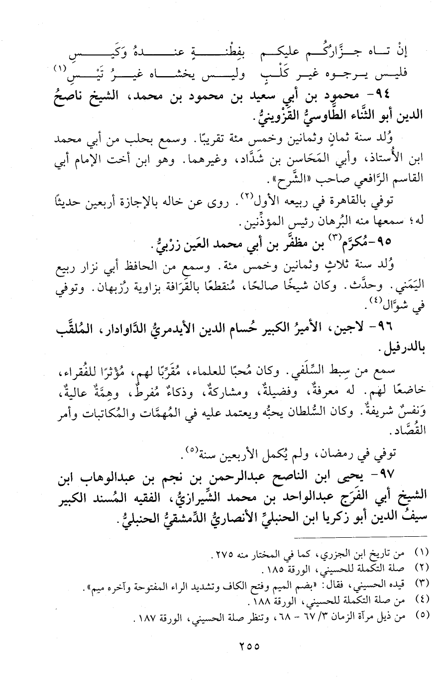 97 - يحيى ابن النّاصح عَبْد الرَّحْمَن بْن نجم بْن عَبْد الوهاب ابن الشَّيْخ أَبِي الفَرَج عَبْد الواحد بن محمد الّشيرازيّ، الفقيه، المُسْنِد الكبير، سيفُ الدّين، أبو زكريا ابن الحنبليّ، الأَنْصَارِيّ، الدمشقي، الحنبليّ. [المتوفى: 672 هـ]-[256]-