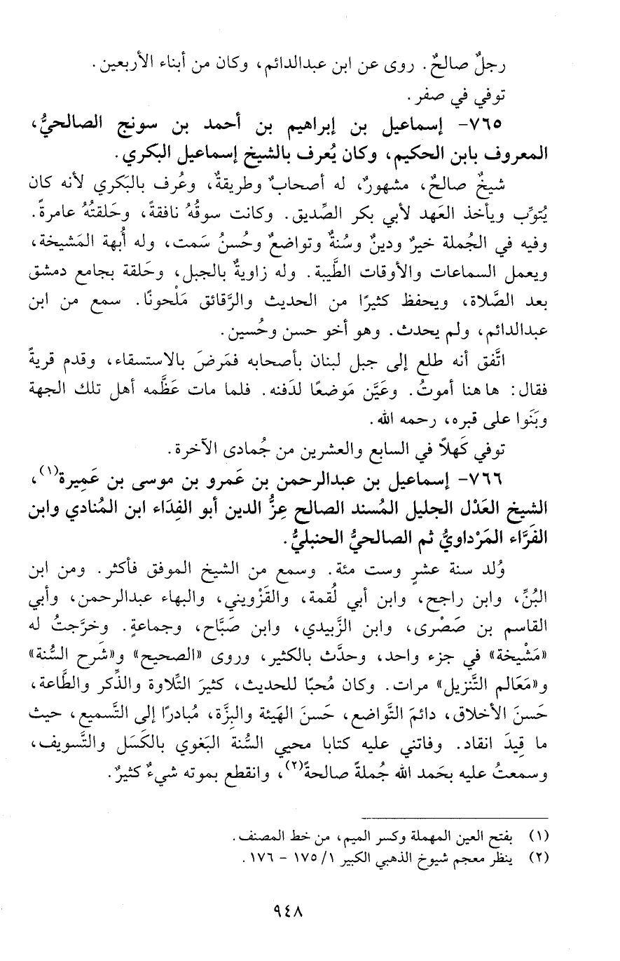 766 - إِسْمَاعِيل بْن عَبْد الرَّحْمَن بْن عَمْرو بْن مُوسَى بْن عُمَيْرة، الشَّيْخ العَدْل، الجليل، المُسْنِد الصّالح، عزَّ الدين، أبو الفداء ابن المنادي وابن الفرّاء المرداويّ، ثُمَّ الصّالحيّ، الحنبليّ. [المتوفى: 700 هـ]