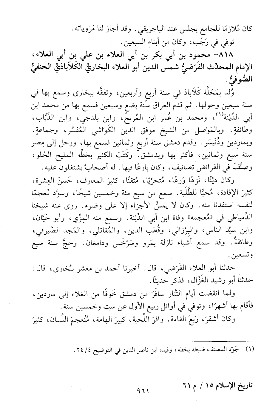 818 - محمود بْن أَبِي بَكْر بْن أبي العلاء بْن عليّ بْن أبي العلاء، الإِمَام، المحدّث، الفَرَضيّ، شمس الدِّين، أَبُو العلاء الْبُخَارِيّ، الكلاباذيّ، الحَنَفِيّ، الصُّوفيّ. [المتوفى: 700 هـ]