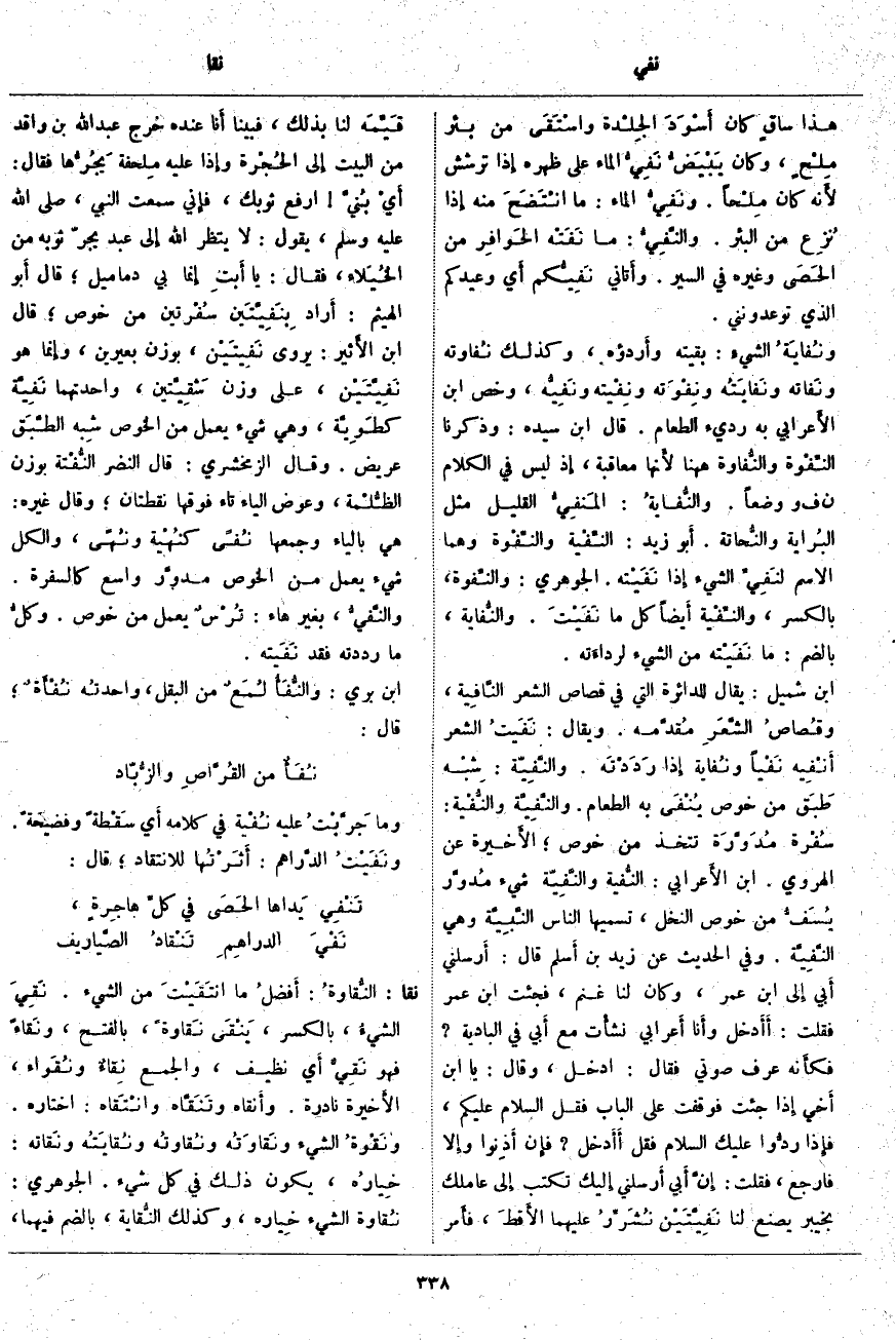 ، بِوَزْنِ بَعِيرَيْنِ، وإِنما هُوَ نَفِيَّتَيْن، عَلَى وَزْنِ شَقِيَّتين، وَاحِدَتُهُمَا نَفِيَّة كطَوِيَّة، وَهِيَ شَيْءٌ يُعْمَلُ مِنَ الْخُوصِ شِبه الطَّبَق عَرِيضٌ. وَقَالَ الزَّمَخْشَرِيُّ: قَالَ النَّضِرُ النُّفْتة بِوَزْنِ الظُّلْمة، وَعِوَضُ الْيَاءِ تَاءٌ فَوْقَهَا نُقْطَتَانِ؛ وَقَالَ غَيْرُهُ: هِيَ بِالْيَاءِ وَجَمْعُهَا نُفًى كنُهْية ونُهًى، وَالْكُلُّ شَيْءٌ يُعْمَلُ مِنَ الْخُوصِ مدوَّر وَاسِعٌ كَالسُّفْرَةِ. والنَّفِيُّ، بِغَيْرِ هَاءٍ: تُرْسٌ يُعْمَلُ مِنْ خُوصٍ. وكلُّ مَا رَدَدْتَهُ فَقَدْ نَفَيته. ابْنُ بَرِّيٍّ: والنُّفَأُ لُمَعٌ مِنَ الْبَقْلِ، واحدتُه نُفْأَةٌ؛ قَالَ: