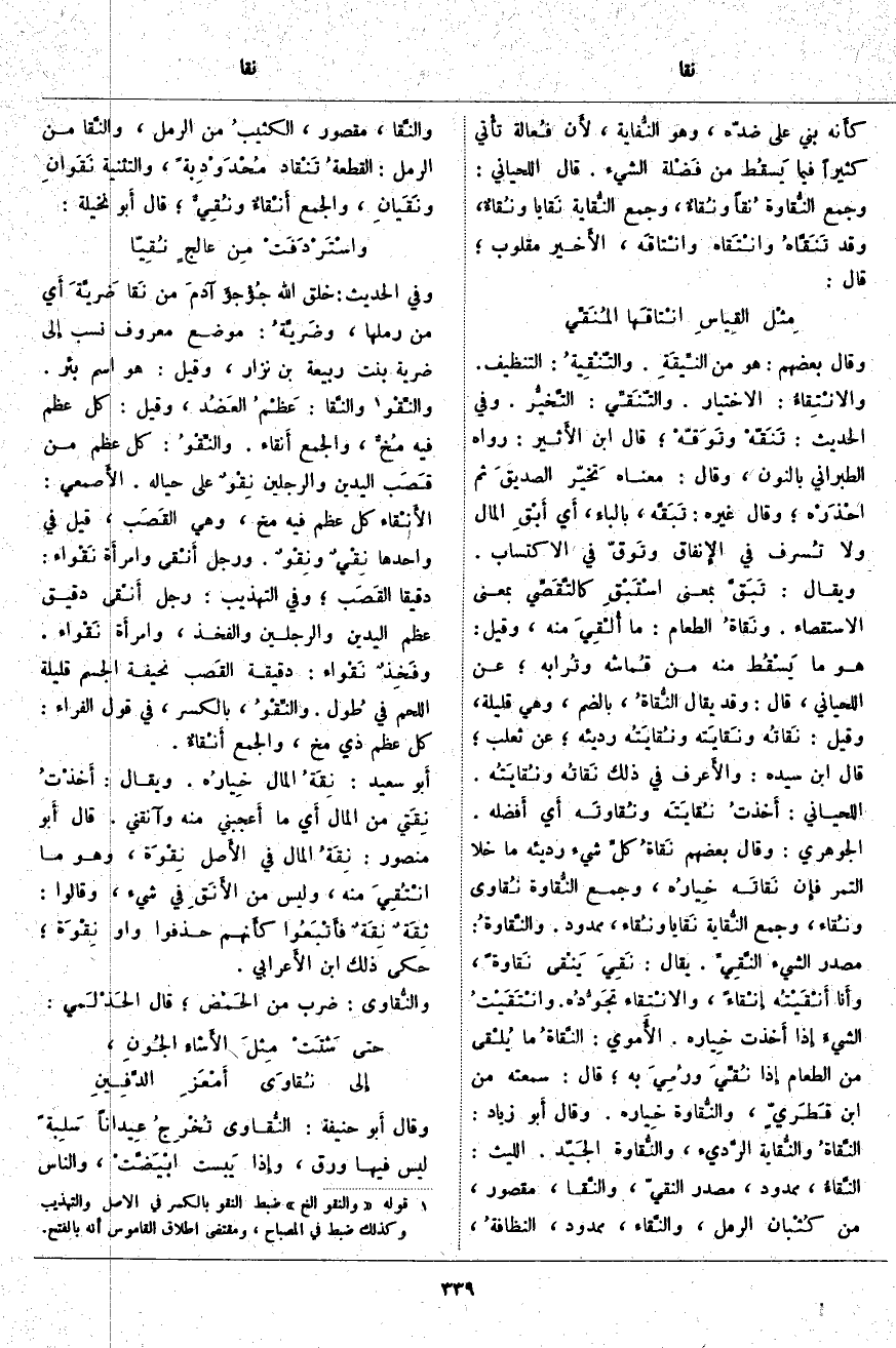 ؛ قَالَ ابْنُ الأَثير: رَوَاهُ الطَّبَرَانِيُّ بِالنُّونِ، وَقَالَ: مَعْنَاهُ تَخيّر الصديقَ ثُمَّ احْذَرْه؛ وَقَالَ غيره: تَبَقَّه، بالياءِ، أَي أَبْقِ الْمَالَ وَلَا تُسرف فِي الإِنفاق وتَوقّ فِي الِاكْتِسَابِ. وَيُقَالُ: تَبَقَّ بِمَعْنَى اسْتَبْقِ كالتَقَصِّي بِمَعْنَى الِاسْتِقْصَاءِ. ونَقَاةُ الطَّعَامِ: مَا أُلقِيَ مِنْهُ، وَقِيلَ: هُوَ مَا يَسْقُط مِنْهُ مِنْ قُماشه وتُرابه؛ عَنِ اللِّحْيَانِيِّ، قَالَ: وَقَدْ يُقَالُ النُّقَاةُ، بِالضَّمِّ، وَهِيَ قَلِيلَةٌ، وَقِيلَ: نَقاتُه ونَقَايَتُه ونُقَايَتُه رَدِيئُهُ؛ عَنْ ثَعْلَبٍ؛ قَالَ ابْنُ سِيدَهْ: والأَعرف فِي ذَلِكَ نَقاتُه ونُقايَتُه. اللِّحْيَانِيُّ: أَخذتُ نُقايَتَه ونُقاوتَه أَي أَفضله. الْجَوْهَرِيُّ: وَقَالَ بَعْضُهُمْ نَقاةُ كلِّ شَيْءٍ رَدِيئُهُ مَا خَلَا التَّمْرَ فإِن نَقاتَه خِيارُه، وَجَمْعُ النُّقَاوة نُقَاوَى ونُقَاء، وَجَمْعُ النُّقَاية نَقايا ونُقاء، مَمْدُودٌ. والنَّقاوةُ: مَصْدَرُ الشَّيْءِ النَّقِيِّ. يُقَالُ: نَقِيَ يَنْقَى نَقاوةً، وأَنا أَنْقَيْتُه إِنْقاءً، والانْتِقاء تَجَوُّدُه. وانْتَقَيْتُ الشيءَ إِذا أَخذت خِياره. الأَموي: النَّقَاةُ مَا يُلْقى مِنَ الطَّعَامِ إِذا نُقِّيَ ورُمِيَ بِهِ؛ قَالَ: سَمِعْتُهُ مِنَ ابْنِ قَطَريٍّ، والنُّقاوة خِياره. وَقَالَ أَبو زِيَادٍ: النَّقاةُ والنُّقاية الرَّديء، والنُّقاوة الجَيّد. اللَّيْثُ: النَّقاءُ، مَمْدُودٌ، مَصْدَرُ النَّقِيِّ، والنَّقا، مَقْصُورٌ، مِنْ كُثْبان الرَّمْلِ، والنَّقاء، مَمْدُودٌ، النظافةُ، والنَّقَا، مَقْصُورٌ، الكثيبُ مِنَ الرَّمْلِ، والنَّقَا مِنَ الرَّمْلِ: القطعةُ تَنْقاد مُحْدَوْدِبةً، وَالتَّثْنِيَةُ نَقَوانِ ونَقَيانِ، وَالْجَمْعُ أَنْقَاءٌ ونُقِيٌّ؛ قَالَ أَبو نُخَيْلَةَ: