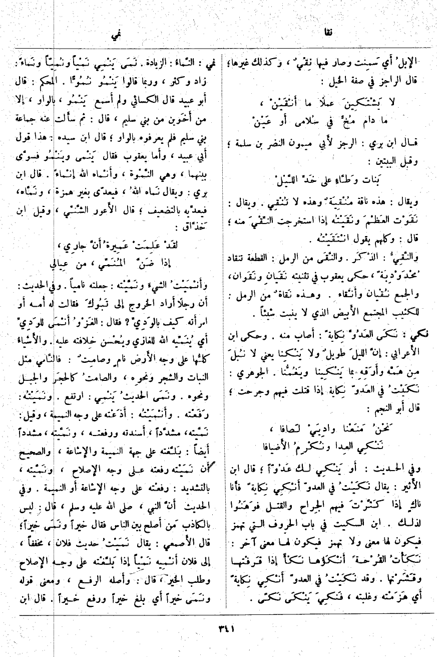 نكي: نَكَى العَدُوَّ نِكايةً: أَصاب مِنْهُ. وَحَكَى ابْنُ الأَعرابي: إِنَّ الليلَ طويلٌ وَلَا يَنْكِنا يَعْنِي لَا نُبلَ مِن هَمِّه وأَرَقِهِ بِمَا يَنْكِينا ويَغُمُّنا. الْجَوْهَرِيُّ: نَكَيْتُ فِي العَدوّ نِكاية إِذا قَتَلْتَ فِيهِمْ وَجَرَحْتَ؛ قَالَ أَبو النَّجْمِ: