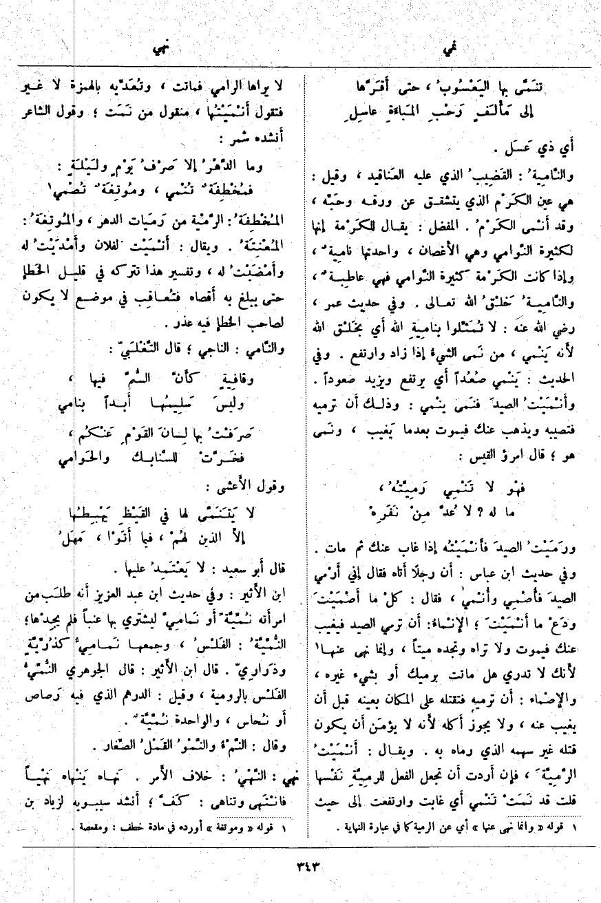 أَي ذِي عَسَل. والنَّامِيةُ: القَضِيبُ الَّذِي عَلَيْهِ العَناقيد، وَقِيلَ: هِيَ عَيْنُ الكَرْم الَّذِي يَتَشَقَّقُ عَنْ وَرَقِهِ وحَبِّه، وَقَدْ أَنْمَى الكَرْمُ. الْمُفَضَّلُ: يُقَالُ للكَرْمة إِنها لِكَثِيرَةُ النَّوَامِي وَهِيَ الأَغصان، وَاحِدَتُهَا نَامِيَةٌ، وإِذا كَانَتِ الكَرْمة كَثِيرَةَ النَّوامي فَهِيَ عاطِبةٌ، والنَّامِيةُ خَلْقُ اللَّهُ تَعَالَى. وَفِي حَدِيثِ