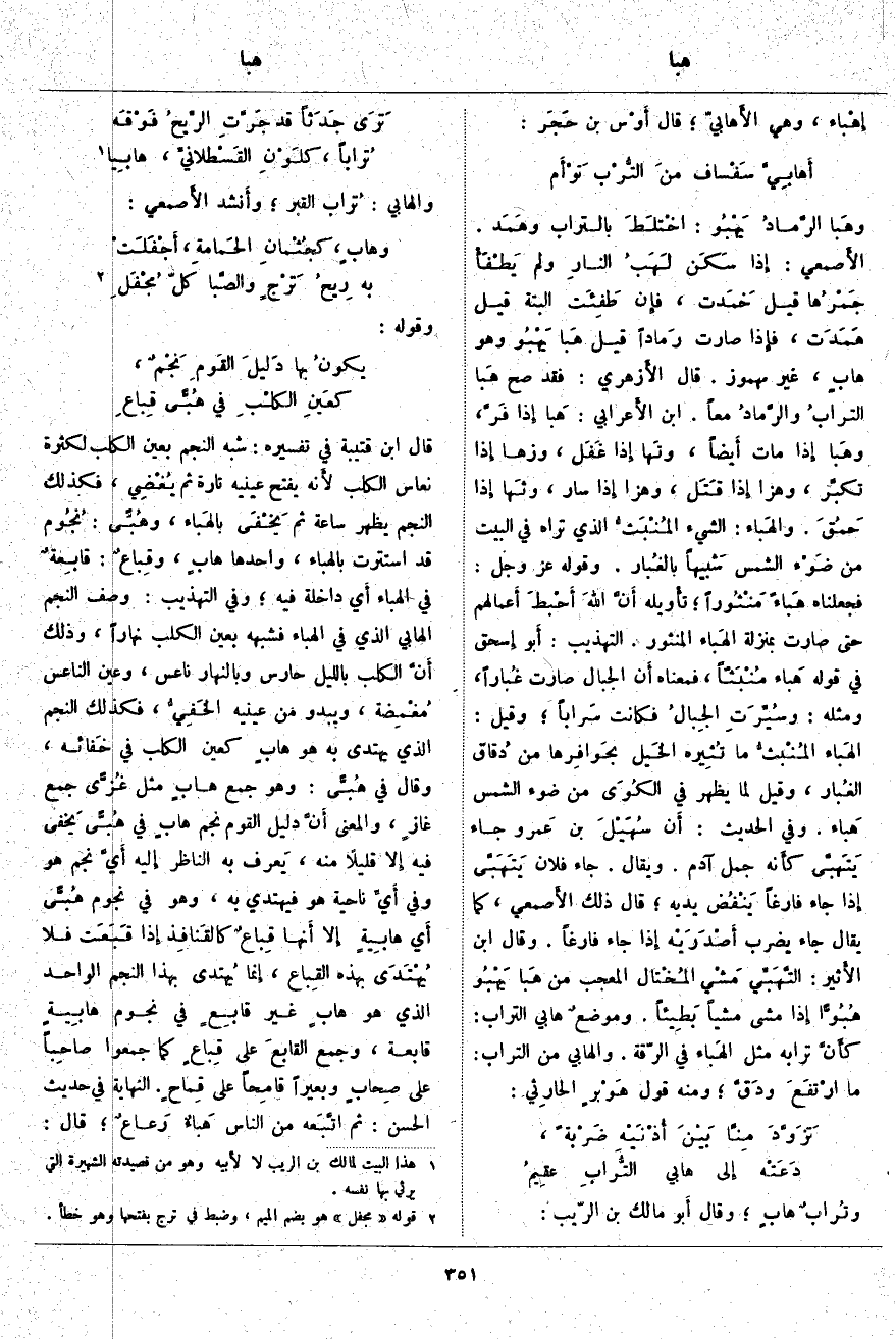 قَالَ ابْنُ قُتَيْبَةَ فِي تَفْسِيرِهِ: شَبَّهَ النَّجْمَ بِعَيْنِ الْكَلْبِ لِكَثْرَةِ نُعَاسِ الْكَلْبِ لأَنه يَفْتَحُ عَيْنَيْهِ تَارَةً ثُمَّ يُغْضِي فَكَذَلِكَ النَّجْمُ يَظْهَرُ سَاعَةً ثُمَّ يَخْفَى بالهَباء، وهُبًّى: نُجُوم قَدِ اسْتَتَرَتْ بِالْهَبَاءِ، وَاحِدُهَا هابٍ، وقِباعٌ: قابِعةٌ فِي الْهَبَاءِ أَي دَاخِلَةٌ فِيهِ؛ وَفِي التَّهْذِيبِ: وَصَفَ النَّجْمَ الْهَابِي الَّذِي فِي الْهَبَاءِ فَشَبَّهَهُ بِعَيْنِ الْكَلْبِ نَهَارًا، وَذَلِكَ أَنَّ الْكَلْبَ بِاللَّيْلِ حَارِسٌ وَبِالنَّهَارِ نَاعِسٌ، وَعَيْنُ النَّاعِسِ مُغْمِضة، وَيَبْدُو مِنْ عَيْنَيْهِ الخَفِيُّ، فَكَذَلِكَ النَّجْمُ الَّذِي يُهْتَدَى بِهِ هُوَ هابٍ كَعَيْنِ الْكَلْبِ فِي خَفائه، وَقَالَ فِي هُبًّى: وَهُوَ جَمْعُ هابٍ مِثْلُ غُزًّى جَمْعُ غازٍ، وَالْمَعْنَى أَنَّ دَلِيلَ الْقَوْمِ نَجْمٌ هابٍ فِي هُبًّى يَخفى فِيهِ إِلا قَلِيلًا مِنْهُ، يَعرف بِهِ النَّاظِرُ إِليه أَيَّ نَجْمٍ هُوَ وَفِي أَيِّ نَاحِيَةٍ هُوَ فَيَهْتَدِي بِهِ، وَهُوَ فِي نُجُومِ هُبًّى أَي هابِيةٍ إِلا أَنها قِباعٌ كالقَنافِذ إِذا قَبَعَت فَلَا يُهْتَدَى بِهَذِهِ القِباع، إِنما يُهتدى بِهَذَا النَّجْمِ الْوَاحِدِ الَّذِي هُوَ هابٍ غَيْرُ قابِعٍ فِي نُجُومٍ هابِيةٍ قَابِعَةٍ، وَجَمَعَ القابعَ عَلَى قِباعٍ كَمَا جَمَعُوا صَاحِبًا عَلَى صِحابٍ وَبَعِيرًا قامِحاً عَلَى قِماحٍ. النِّهَايَةُ فِي حَدِيثِ