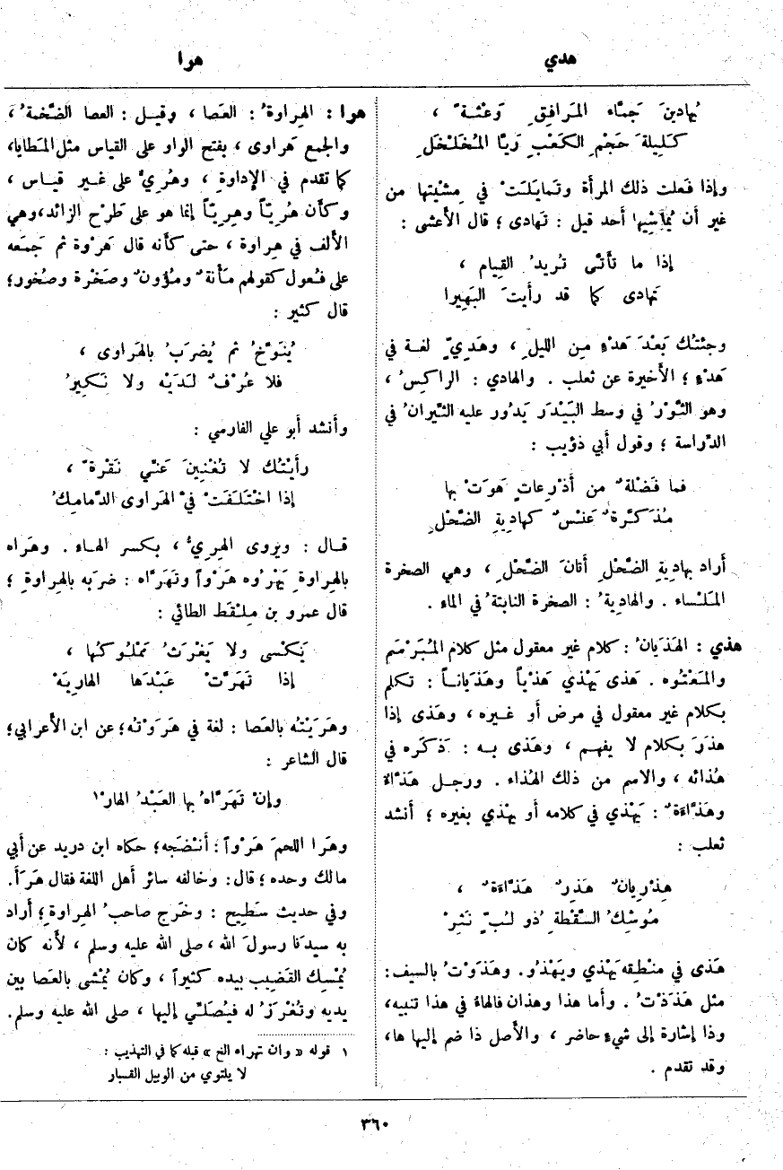 هرا: الهِرَاوَةُ: العَصا، وَقِيلَ: الْعَصَا الضَّخمةُ، وَالْجَمْعُ هَرَاوَى، بِفَتْحِ الْوَاوِ عَلَى الْقِيَاسِ مِثْلُ المَطايا، كَمَا تَقَدَّمَ فِي الإِداوةِ، وهُرِيٌّ عَلَى غَيْرِ قِيَاسٍ، وكأَن هُرِيّاً وهِرِيّاً إِنما هُوَ عَلَى طَرْح الزَّائِدِ، وَهِيَ الأَلف فِي هِراوة، حَتَّى كأَنه قَالَ هَرْوَة ثُمَّ جَمَعه عَلَى فُعول كَقَوْلِهِمْ مَأْنةٌ ومُؤُونٌ وصَخْرة وصُخور؛ قَالَ كُثَيِّرٌ:
