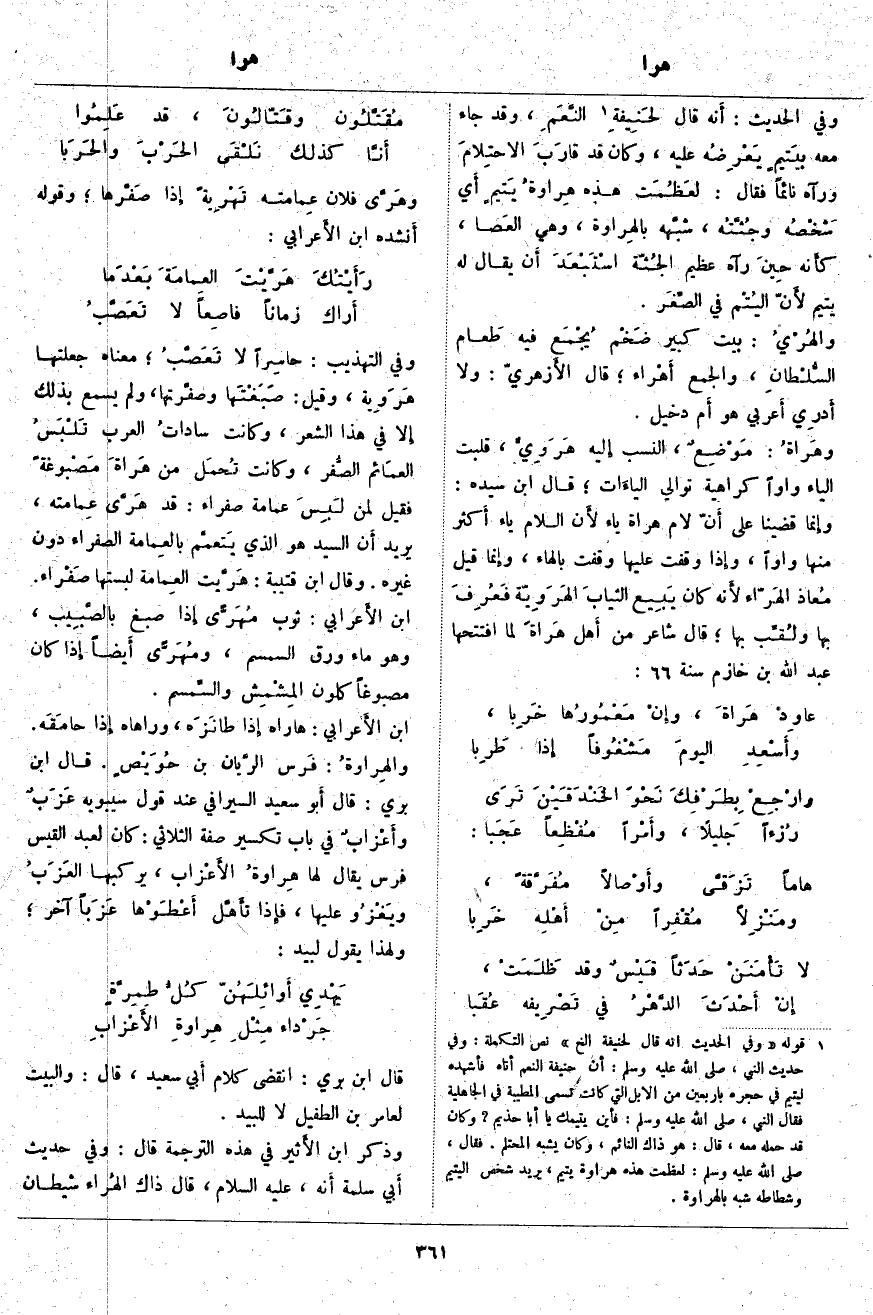 وَفِي التَّهْذِيبِ: حاسِراً لَا تَعَصَّبُ؛ مَعْنَاهُ جَعَلْتَهَا هَرَوِية، وَقِيلَ: صَبَغْتَها وصفَّرتها، وَلَمْ يُسْمَعْ بِذَلِكَ إِلا فِي هَذَا الشِّعْرِ، وَكَانَتْ ساداتُ الْعَرَبِ تَلْبَسُ العمَائم الصُّفر، وَكَانَتْ تُحمَل مِنْ هَراةَ مَصْبوغةً فَقِيلَ لِمَنْ لَبِسَ عِمَامَةً صَفْرَاءَ: قَدْ هَرَّى عِمامته، يُرِيدُ أَن السَّيِّدَ هُوَ الَّذِي يتَعمَّم بالعِمامة الصَّفْرَاءِ دُونَ غَيْرِهِ. وَقَالَ ابْنُ قُتَيْبَةَ: هَرَّيت العِمامة لَبِسْتَهَا صَفْراء. ابْنُ الأَعرابي: ثَوْبٌ مُهَرًّى إِذا صُبِغَ بالصَّبِيب، وَهُوَ مَاءُ وَرَقِ السِّمْسِمِ، ومُهَرًّى أَيضاً إِذا كَانَ مَصْبُوغًا كَلَوْنِ المِشْمِش والسِّمسم. ابْنُ الأَعرابي: هَارَاه إِذا طانَزَه، وَرَاهَاهُ إِذا حامَقَه. والهِرَاوَةُ: فَرس الرَّيان بْنُ حُوَيْصٍ. قَالَ ابْنُ بَرِّيٍّ: قَالَ أَبو سَعِيدٍ السِّيرَافِيُّ عِنْدَ قَوْلِ سِيبَوَيْهِ عَزَبٌ وأَعْزابٌ فِي بَابِ تَكْسِيرِ صِفَةِ الثُّلَاثِيِّ: كَانَ لِعَبْدِ الْقَيْسِ فَرَسٌ يُقَالُ لَهَا هِرَاوَةُ الأَعْزاب، يَرْكَبُهَا العَزَبُ ويَغْزُو عَلَيْهَا، فإِذا تأَهَّل أَعْطَوْها عَزَباً آخَرَ؛ وَلِهَذَا يَقُولُ لَبِيَدٌ: