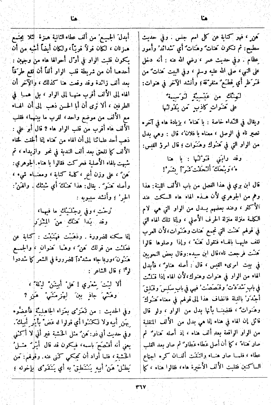 قَالَ ابْنُ بَرِّيٍّ فِي هَذَا الْفَصْلِ مِنْ بَابِ الأَلف اللَّيِّنَةِ: هَذَا وَهْمٌ مِنَ الْجَوْهَرِيِّ لأَن هَذِهِ الْهَاءَ هَاءُ السَّكْتِ عِنْدَ الأَكثر، وَعِنْدَ بَعْضِهِمْ بَدَلٌ مِنَ الْوَاوِ الَّتِي هِيَ لَامٌ الْكَلِمَةِ مُنَزَّلَةٌ مَنْزِلَةَ الْحَرْفِ الأَصلي، وَإِنَّمَا تِلْكَ الْهَاءُ الَّتِي فِي قَوْلِهِمْ هَنْت الَّتِي تُجْمَعُ هَنات وهَنَوات، لأَن الْعَرَبَ تَقِفُ عَلَيْهَا بِالْهَاءِ فَتَقُولُ هَنَهْ، وَإِذَا وَصَلُوهَا قَالُوا هَنْت فَرَجَعَتْ تَاءً، قَالَ ابْنُ سِيدَهْ: وَقَالَ بَعْضُ النَّحْوِيِّينَ فِي بَيْتِ امْرِئِ الْقَيْسِ، قَالَ: أَصله هناوٌ، فأَبدل الْهَاءَ مِنَ الْوَاوِ فِي هَنَوَاتٍ وَهْنُوكَ، لأَن الْهَاءَ إِذَا قَلَّت فِي بابِ شَدَدْتُ وقَصَصْتُ فَهِيَ فِي بابِ سَلِسَ وقَلِقَ أَجْدَرُ بالقِلة فَانْضَافَ هَذَا إِلَى قَوْلِهِمْ فِي مَعْنَاهُ هَنُوكَ وهَنواتٌ، فَقَضَيْنَا بأَنها بَدَلٌ مِنَ الْوَاوِ، وَلَوْ قَالَ قَائِلٌ إِنَّ الْهَاءَ فِي هَنَاه إِنَّمَا هِيَ بَدَلٌ مِنَ الأَلف الْمُنْقَلِبَةِ مِنَ الْوَاوِ الْوَاقِعَةِ بَعْدَ أَلِفِ هَنَاهُ، إِذْ أَصله هَناوٌ ثُمَّ صارَ هَناءً، كَمَا أَن أَصل عَطاء عَطاوٌ ثُمَّ صَارَ بَعْدَ الْقَلْبِ عَطَاءً، فَلَمَّا صَارَ هَنَاءً والتَقَت أَلفان كُرِهَ اجْتِمَاعُ السَّاكِنَيْنِ فَقُلِبَتِ الأَلف الأَخيرة هَاءً، فَقَالُوا هِنَاهُ، كَمَا أَبدلَ الجميعُ مِنْ أَلف عَطَاءٍ الثَّانِيَةِ هَمْزَةً لِئَلَّا يَجْتَمِعَ هَمْزَتَانِ، لَكَانَ قَوْلًا قَوِيًّا،، وَلَكَانَ أَيضاً أَشبه مِنْ أَن يَكُونَ قُلِبَتِ الْوَاوُ فِي أَوّل أَحوالها هَاءً مِنْ وَجْهَيْنِ: أَحدهما أَن مِنْ شَرِيطَةِ قَلْبِ الْوَاوِ أَلفاً أَن تَقَعَ طرَفاً بَعْدَ أَلف زَائِدَةٍ وَقَدْ وَقَعَتْ هُنَا كَذَلِكَ، وَالْآخَرُ أَن الْهَاءَ إِلَى الأَلف أَقرب مِنْهَا إِلَى الْوَاوِ، بَلْ هُمَا فِي الطَّرَفَيْنِ، أَلا تَرَى أَن أَبا الْحَسَنِ ذَهَبَ إِلَى أَن الْهَاءَ مَعَ الأَلف مِنْ مَوْضِعٍ وَاحِدٍ، لَقُرْبِ مَا بَيْنَهُمَا، فَقَلْبُ الأَلف هَاءً أَقْرَبُ مِنْ قَلْبِ الْوَاوِ هَاءً؟ قَالَ أَبو عَلِيٍّ: ذَهَبَ أَحد عُلَمَائِنَا إِلَى أَن الْهَاءَ مِنْ هَناه إِنَّمَا أُلحقت لِخَفَاءِ الأَلف كَمَا تَلْحَقُ بَعْدَ أَلف النُّدْبَةِ فِي نَحْوِ وا زيداه، ثم شبهت بالهاء الأَصلية فَحُرِّكَتْ فَقَالُوا يَا هَنَاهُ. الْجَوْهَرِيُّ: هَنٌ، عَلَى وَزْنِ أَخٍ، كَلِمَةُ كِنَايَةٍ، وَمَعْنَاهُ شَيْءٌ، وأَصله هَنَوٌ. يُقَالُ: هَذَا هَنُكَ أَي شَيْئُكَ. والهَنُ: الحِرُ؛ وأَنشد سِيبَوَيْهِ: