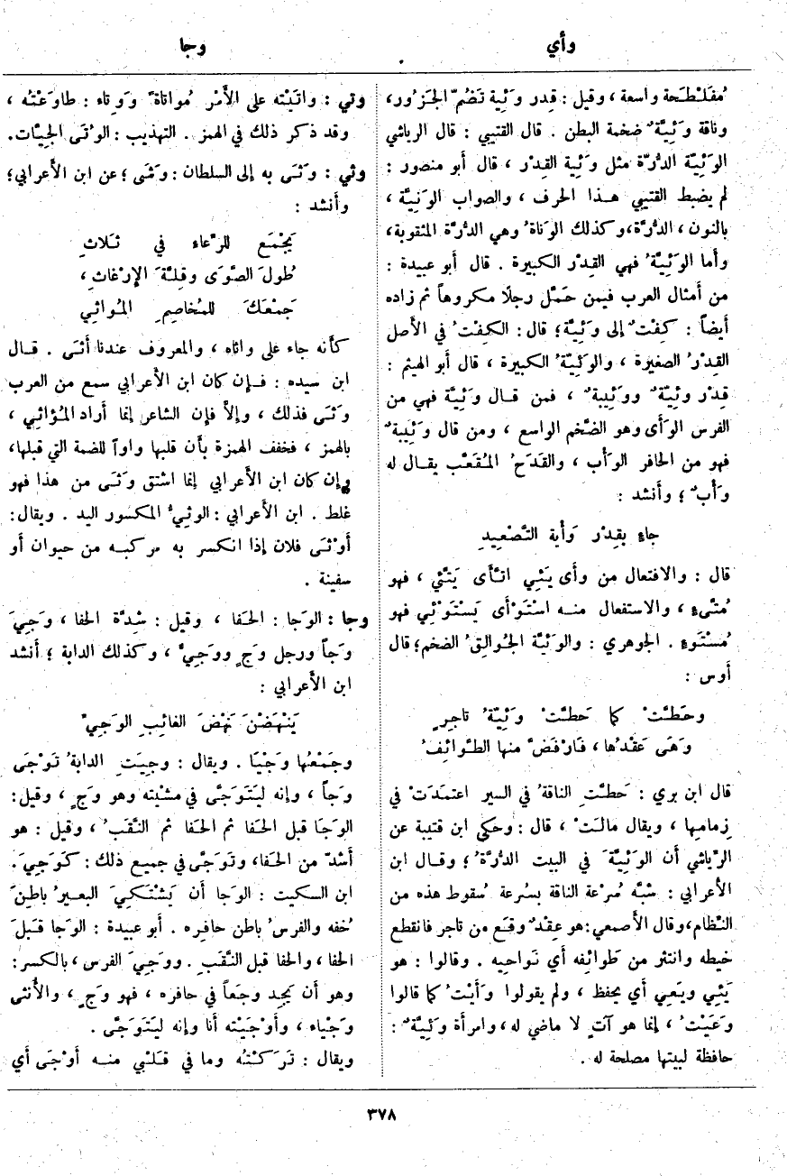وجا: الوَجا: الحَفا، وَقِيلَ: شِدَّة الْحَفَا، وَجِيَ وَجاً وَرَجُلٌ وَجٍ ووَجِيٌّ، وَكَذَلِكَ الدَّابَّةُ؛ أَنشد ابْنُ الأَعرابي: