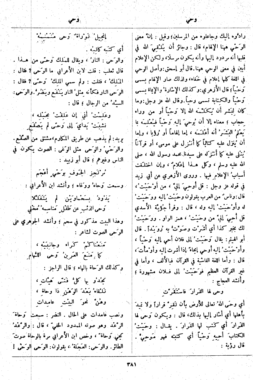 أَي وحَى اللهُ تَعَالَى للأَرض بأَن تَقِرَّ قَرَارًا وَلَا تميدَ بأَهلها أَي أَشار إِلَيْهَا بِذَلِكَ، قَالَ: وَيَكُونُ وَحى لَهَا القَرارَ أَي كَتب لَهَا القَرارَ. يُقَالُ: وحَيْتُ الكتابَ أَحِيهِ وَحْياً أَي كَتَبْتُهُ فَهُوَ مَوحِيٌّ. قَالَ رُؤْبَةُ: