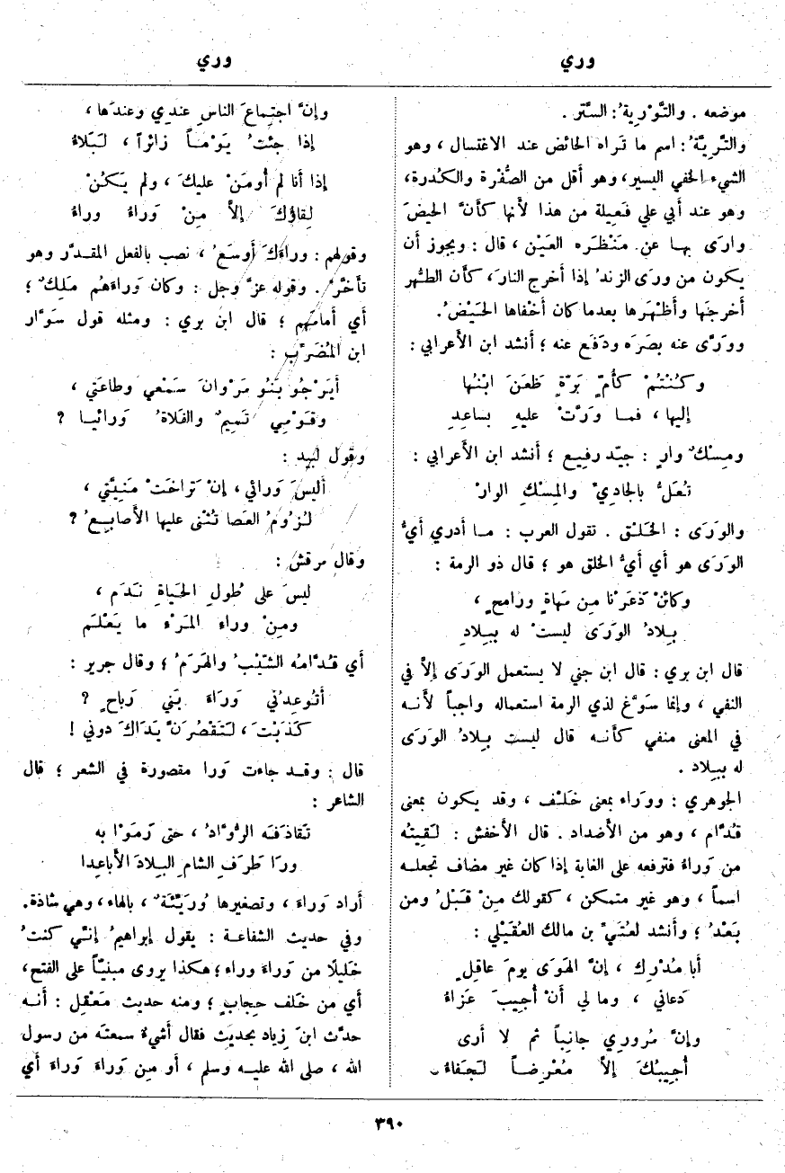 مَوْضِعِهِ. والتَّوْرِيةُ: السَّتْرُ. والتَّرِيَّةُ: اسْمُ مَا تَراه الْحَائِضُ عِنْدَ الِاغْتِسَالِ، وَهُوَ الشَّيْءُ الْخَفِيُّ الْيَسِيرُ، وَهُوَ أَقل مِنَ الصُّفْرة والكُدرة، وَهُوَ عِنْدَ أَبي عَلِيٍّ فَعِيلة مِنْ هَذَا لأَنها كأَنَّ الحيضَ وارَى بِهَا عَنْ مَنْظَره العَيْن، قَالَ: وَيَجُوزُ أَن يَكُونَ مِنْ ورَى الزندُ إِذا أَخرج النارَ، كأَن الطُّهر أَخرجها وأَظْهَرها بعد ما كَانَ أَخْفاها الحَيْضُ. ووَرَّى عَنْهُ بصَرَه ودَفَع عَنْهُ؛ وأَنشد ابْنُ الأَعرابي:
