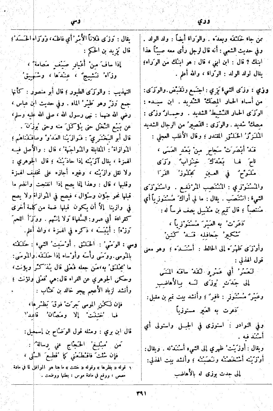 وزي: وزَى الشيءُ يَزِي: اجتَمع وتَقَبَّض. والوَزَى: مِنْ أَسماءِ الْحِمَارِ المِصَكِّ الشَّدِيد. ابْنُ سِيدَهْ: الوَزَى الْحِمَارُ النَّشِيطُ الشَّدِيدُ. وحِمارٌ وَزًى: مِصكٌّ شَدِيدٌ. والوَزى: القًصِيرُ مِنَ الرِّجَالِ الشَّدِيدُ المُلَزَّزُ الخَلْقِ الْمُقْتَدِرُ؛ وَقَالَ الأَغلب الْعِجْلِيُّ: