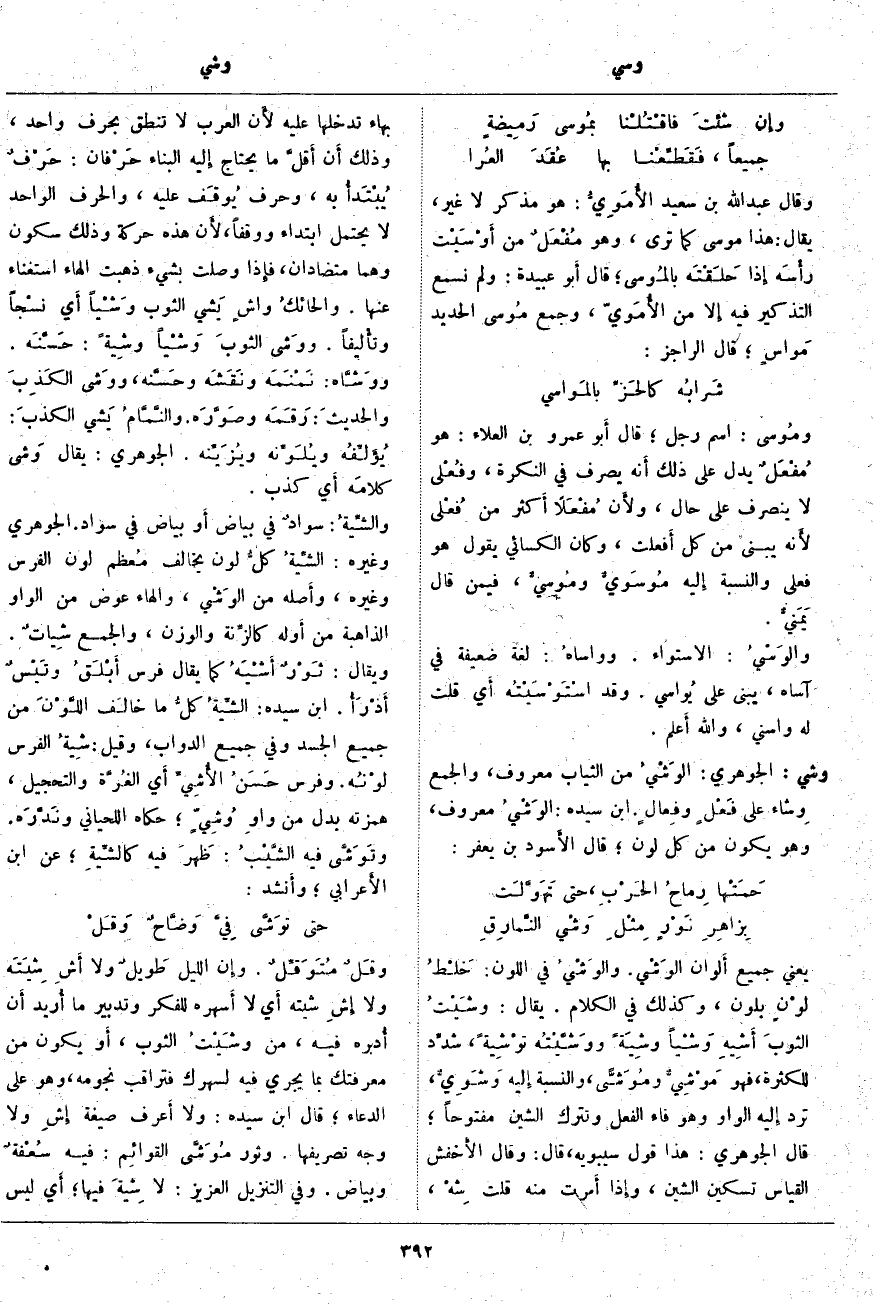 وشي: الْجَوْهَرِيُّ: الوَشْيُ مِنَ الثِّيَابِ مَعْرُوفٌ، وَالْجَمْعُ وِشاء عَلَى فَعْلٍ وفِعالٍ. ابْنُ سِيدَهْ: الوَشْيُ مَعْرُوفٌ، وَهُوَ يَكُونُ مِنْ كُلِّ لَوْنٍ؛ قَالَ الأَسود بْنُ يَعْفُرَ: