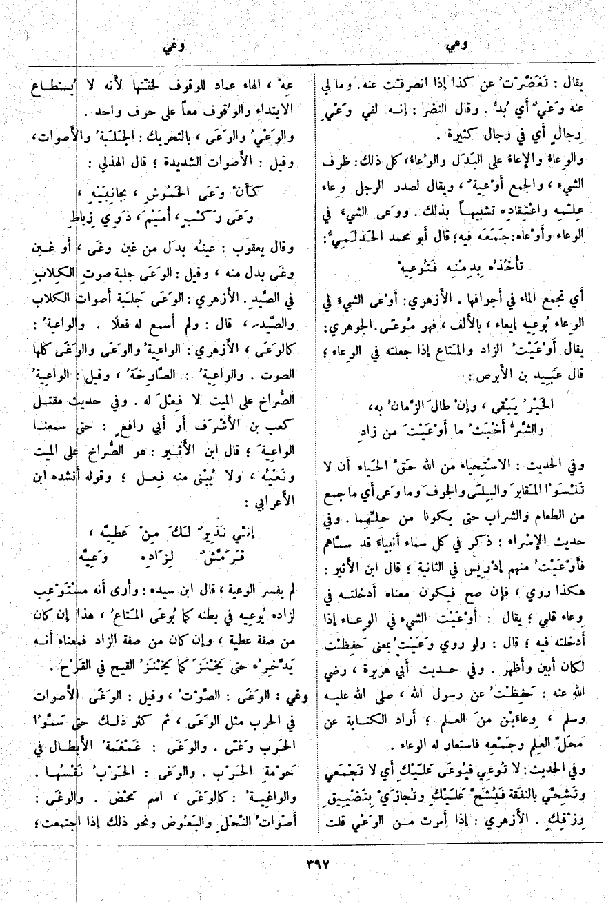 أَي لَا تَجْمَعي وتَشِحِّي بالنفَقة فَيُشَحَّ عَلَيْكِ وتُجازَيْ بَتَضْيِيقِ رِزْقِكِ. الأَزهري: إِذَا أَمرت مِنَ الوَعْي قُلْتَ عِهْ، الْهَاءُ عِمَادٌ لِلْوُقُوفِ لِخِفَّتِهَا لأَنه لَا يُستطاع الِابْتِدَاءُ والوُقوف مَعًا عَلَى حَرْفٍ وَاحِدٍ. والوَعْيُ والوَعَى، بِالتَّحْرِيكِ: الجَلَبةُ والأَصوات، وَقِيلَ: الأَصوات الشَّدِيدَةُ؛ قَالَ الْهُذَلِيُّ: