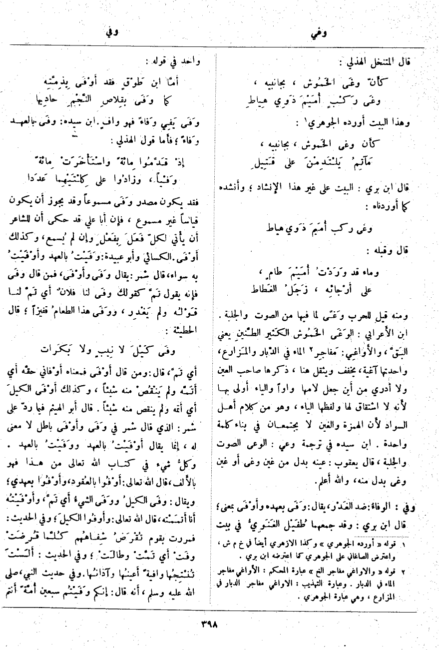 وفى: الوفاءُ: ضِدُّ الغَدْر، يُقَالُ: وَفَى بِعَهْدِهِ وأَوْفَى بِمَعْنًى؛ قَالَ ابْنُ بَرِّيٍّ: وَقَدْ جَمَعَهُمَا طُفَيْل الغَنَوِيُّ فِي بَيْتٍ وَاحِدٍ فِي قَوْلِهِ: