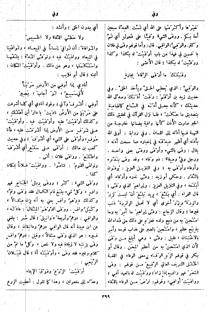 أَي أَشْرَفَ واطَّلَعَ. ووافَى فُلَانٌ: أَتَى. وتوافَى القومُ: تتامُّوا. ووافَيْتُ فُلَانًا بِمَكَانِ كَذَا. ووَفَى الشيءُ: كثُرَ؛ ووَفَى رِيشُ الجَناحِ فَهُوَ وافٍ، وكلُّ شَيْءٍ بلَغ تمامَ الْكَمَالِ فَقَدْ وَفَى وتمَّ، وَكَذَلِكَ دِرْهمٌ وافٍ يَعْنِي بِهِ أَنه يَزِنُ مِثقالًا، وكَيْلٌ وافٍ. ووَفَى الدِّرْهَمُ المِثقالَ: عادَلَه، والوافِي: درهمٌ وأَربعةُ دَوانِيقَ؛ قَالَ شَمِرٌ: بَلَغَنِي عَنِ ابْنِ عْيَيْنَةَ أَنه قَالَ الوافِي درهمٌ ودانِقانِ، وَقَالَ غَيْرُهُ: هُوَ الَّذِي وَفَى مِثقالًا، وَقِيلَ: درهمٌ وافٍ وفَى بزِنتِه لَا زِيَادَةَ فِيهِ وَلَا نَقْصٌ، وكلُّ مَا تمَّ مِنْ كَلَامٍ وَغَيْرِهِ فَقَدْ وفَى، وأَوْفَيْتُه أَنا؛ قَالَ غَيْلانُ الرَّبَعِي: