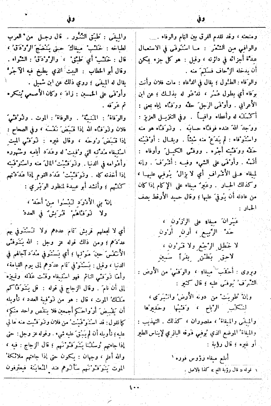 والمِيفَى: طَبَق التَّنُّور. قَالَ رَجُلٌ مِنَ الْعَرَبِ لِطَبَّاخِهِ: خَلِّبْ مِيفاكَ حَتَّى يَنْضَجَ الرَّوْدَقُ، قَالَ: خَلِّبْ أَي طَبِّقْ، والرَّوْدَقُ: الشِّواء. وَقَالَ أَبو الْخَطَّابِ: الْبَيْتُ الَّذِي يُطْبَخُ فِيهِ الآجُرُّ يُقَالُ لَهُ المِيفَى؛ رُوِيَ ذَلِكَ عَنِ ابْنِ شُمَيْلٍ. وأَوْفَى عَلَى الْخَمْسِينَ: زادَ، وَكَانَ الأَصمعي يُنكره ثُمَّ عَرَفه. والوَفاةُ: المَنِيَّةُ. والوفاةُ: الْمَوْتُ. وتُوُفِّيَ فُلَانٌ وتَوَفَّاه اللَّهُ إِذَا قَبَضَ نَفْسَه، وَفِي الصِّحَاحِ: إِذَا قَبَضَ رُوحَه، وَقَالَ غَيْرُهُ: تَوَفِّي الميتِ اسْتِيفاء مُدَّتِه الَّتِي وُفِيتْ لَهُ وعَدَد أَيامِه وشُهوره وأَعْوامه فِي الدُّنْيَا. وتَوَفَّيْتُ المالَ مِنْهُ واسْتوْفَيته إِذَا أَخذته كُلَّهُ. وتَوَفَّيْتُ عَدَد القومِ إِذَا عَدَدْتهم كُلَّهم؛ وأَنشد أَبو عبيدة لِمَنْظُورٍ الوَبْرِي: