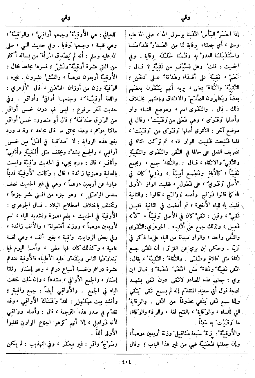 ؛ قَالَ أَبو مَنْصُورٍ: خمسُ أَواقٍ مِائَتَا دِرْهم، وَهَذَا يُحَقِّقُ مَا قَالَ مُجَاهِدٌ، وَقَدْ وَرَدَ بِغَيْرِ هَذِهِ الرِّوَايَةِ: لَا صَدَقة فِي أَقَلَّ مِن خمسِ أَواقِي، وَالْجَمْعُ يشدَّد وَيُخَفَّفُ مِثْلَ أُثْفِيَّةٍ وأَثافِيَّ وأثافٍ، قَالَ: وَرُبَّمَا يَجِيءُ فِي الْحَدِيثِ وُقِيّة وَلَيْسَتْ بِالْعَالِيَةِ وَهَمْزَتُهَا زَائِدَةٌ، قَالَ: وَكَانَتِ الأُوقِيَّة قَدِيمًا عِبَارَةً عَنْ أَربعين دِرْهَمًا، وَهِيَ فِي غَيْرِ الْحَدِيثِ نِصْفُ سُدُسِ الرِّطْلِ، وَهُوَ جُزْءٌ مِنَ اثْنَيْ عَشَرَ جُزْءًا، وَتَخْتَلِفُ بِاخْتِلَافِ اصْطِلَاحِ الْبِلَادِ. قَالَ الْجَوْهَرِيُّ: الأُوقيَّة فِي الْحَدِيثِ، بِضَمِّ الْهَمْزَةِ وَتَشْدِيدِ الْيَاءِ، اسْمٌ لأَربعين دِرْهَمًا، وَوَزْنُهُ أُفْعولةٌ، والأَلف زَائِدَةٌ، وَفِي بَعْضِ الرِّوَايَاتِ وُقِية، بِغَيْرِ أَلف، وَهِيَ لُغَةٌ عَامِّيَّةٌ، وَكَذَلِكَ كَانَ فِيمَا مَضَى، وأَما الْيَوْمُ فِيمَا يَتعارَفُها النَّاسُ ويُقَدِّر عَلَيْهِ الأَطباء فالأُوقية عِنْدَهُمْ عَشَرَةُ دَرَاهِمَ وَخَمْسَةُ أَسباع دِرْهَمٍ، وَهُوَ إِسْتار وَثُلُثَا إِسْتار، وَالْجَمْعُ الأَواقي، مُشَدَّدًا، وإِن شِئْتَ خَفَّفَتِ الْيَاءَ فِي الْجَمْعِ. والأَواقِي أَيضاً: جَمْعُ واقِيةٍ؛ وأَنشد بَيْتَ مهَلْهِلٍ: لقدْ وَقَتْكَ الأَواقِي، وَقَدْ تَقَدَّمَ فِي صَدْرِ هَذِهِ التَّرْجَمَةِ، قَالَ: وأَصله ووَاقِي لأَنه فَواعِل، إِلا أَنهم كَرِهُوا اجْتِمَاعَ الْوَاوَيْنِ فَقَلَبُوا الأُولى أَلفاً. وسَرْجٌ واقٍ: غَيْرُ مِعْقَر، وَفِي التَّهْذِيبِ: لَمْ يَكُنْ