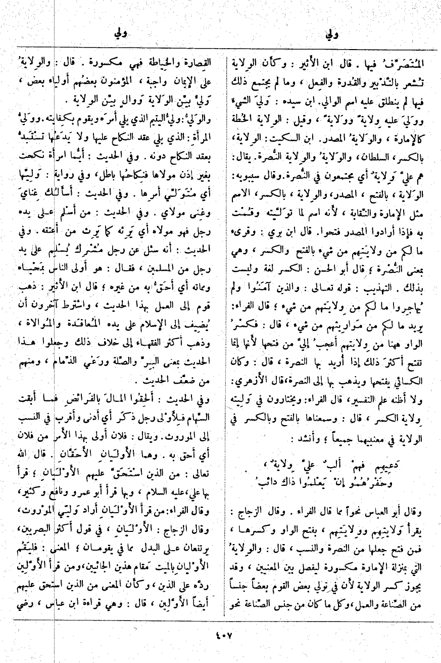 وَقَالَ أَبو الْعَبَّاسِ نَحْوًا مِمَّا قَالَ الْفَرَّاءُ. وَقَالَ الزَّجَّاجُ: يقرأُ وَلايتِهِم ووِلايَتِهم، بِفَتْحِ الْوَاوِ وَكَسْرِهَا، فَمَنْ فَتَحَ جَعَلَهَا مِنَ النُّصْرَةِ وَالنَّسَبِ، قَالَ: والوِلايةُ الَّتِي بِمَنْزِلَةِ الإِمارة مَكْسُورَةٌ لِيَفْصِلَ بَيْنَ الْمَعْنَيَيْنِ، وَقَدْ يَجُوزُ كَسْرُ الْوِلَايَةِ لأَن فِي تَوَلِّي بَعْضِ الْقَوْمِ بَعْضًا جِنْسًا مِنَ الصِّناعة وَالْعَمَلِ، وَكُلُّ مَا كَانَ مِنَ جِنْسِ الصِّناعة نَحْوَ القِصارة والخِياطة فَهِيَ مَكْسُورَةٌ. قَالَ: والوِلايةُ عَلَى الإِيمان وَاجِبَةٌ، الْمُؤْمِنُونَ بعضُهم أَولياء بَعْضٍ، وَليٌّ بيِّن الوَلايةِ ووالٍ بيِّن الوِلاية. والوَلِيُّ: وليُّ الْيَتِيمِ الَّذِي يَلِي أَمرَه وَيَقُومُ بكِفايته. ووَليُّ المرأَةِ: الَّذِي يَلِي عَقْدَ النِّكَاحِ عَلَيْهَا وَلَا يَدَعُها تسْتَبدُّ بِعَقْدِ النِّكَاحِ دُونَهُ. وَفِي الْحَدِيثِ: