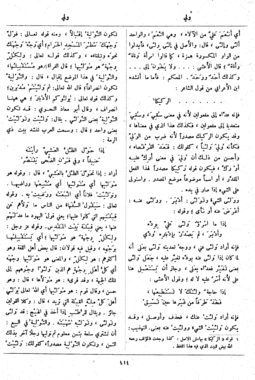 فإِنه عدَّاه إِلَى مَفْعُولَيْنِ لأَنه فِي مَعْنَى سُقِيَ، وسُقِيَ مُتَعَدِّيَةٌ إِلى مَفْعُولَيْنِ، فَكَذَلِكَ هَذَا الَّذِي فِي مَعْنَاهَا، وَقَدْ يَكُونُ الرَّكِيكُ مَصْدَرًا لأَنه ضَرْبٌ مِنَ الوَليّ فكأَنه وُليَ وَلْياً، كَقَوْلِكَ: قَعَدَ القُرْفُصاء، وأَحسن مِنْ ذَلِكَ أَن وُليَ فِي مَعْنَى أُرِكَّ عَلَيْهِ أَوْ رُكَّ، فَيَكُونُ قَوْلُهُ رَكِيكا مَصْدَرًا لِهَذَا الْفِعْلِ المقدَّر، أَو اسْمًا مَوْضُوعًا مَوْضِعَ الْمَصْدَرِ. وَاسْتَوْلَى عَلَى الشَّيْءِ إِذا صَارَ فِي يَدِهِ. ووَلَّى الشيءُ وتَوَلَّى: أَدْبَرَ. ووَلَّى عَنْهُ: أَعْرَضَ عَنْهُ أَو نَأَى، وَقَوْلُهُ: