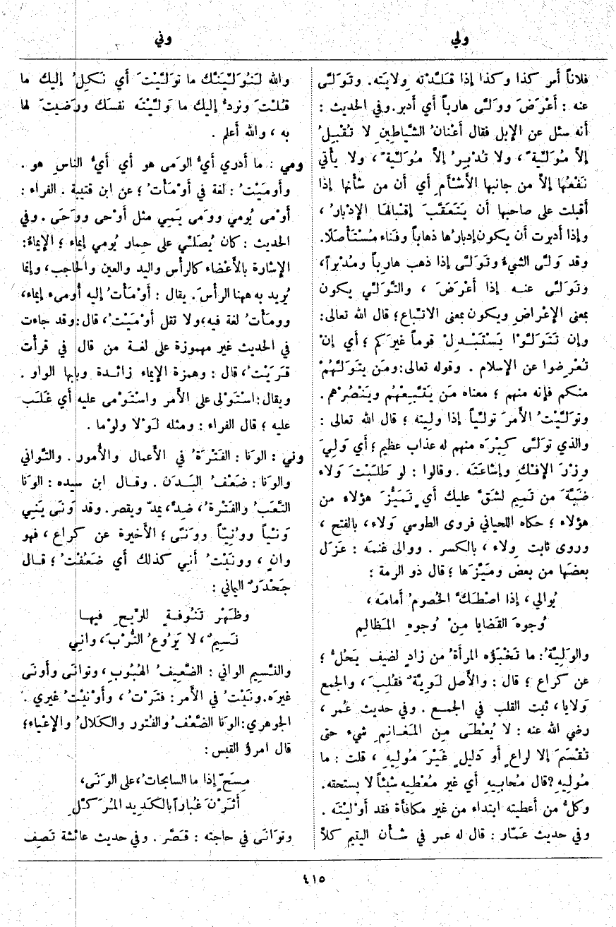، أَي وَلِيَ وِزْرَ الإِفْكِ وإِشاعَتَه. وَقَالُوا: لَوْ طَلَبْتَ وَلاء ضَبَّةَ مِنْ تَمِيم لشَقَّ عَلَيْكَ أَي تَمَيُّزَ هَؤُلَاءِ مِنْ هَؤُلَاءِ، حَكَّاهُ اللِّحْيَانِيُّ فَرَوَى الطُّوسِيُّ وَلاء، بِالْفَتْحِ، وَرَوَى ثَابِتٌ وِلاء، بِالْكَسْرِ. وَوَالَى غنمَه: عَزَل بعضَها مِنْ بَعْضٍ ومَيَّزَها، قَالَ ذُو الرُّمَّةِ:
