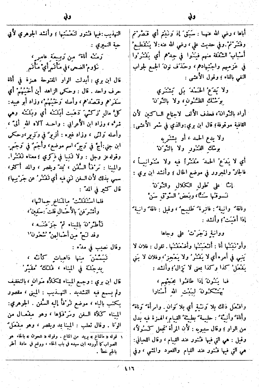 قَالَ ابْنُ بَرِّيٍّ: أُبدلت الْوَاوُ الْمَفْتُوحَةُ هَمْزَةً فِي أَناة حَرْفٍ وَاحِدٍ. قَالَ: وَحَكَى الزَّاهِدُ أَين أَخْيُهُمْ أَي سَفَرُهم وقَصْدُهم، وأَصله وَخْيُهُمْ، وَزَادٌ أَبو عُبَيْدٍ: كلُّ مالٍ زُكِّيَ ذَهَبت أَبَلَتُه أَي وبَلَتُه وَهِيَ شرُّه، وَزَادَ ابْنُ الأَعرابي: وَاحِدُ آلاءِ اللهِ أَلىً، وأَصله وَلًى، وَزَادَ غَيْرُهُ: أَزِيرٌ فِي وَزِيرٍ، وَحَكَى ابْنُ جِنِّي: أَجٌّ فِي وَجٍّ، اسْمُ مَوْضِعٍ، وأَجَمٌ فِي وَجَمٍ. وَقَوْلُهُ عَزَّ وَجَلَّ: وَلا تَنِيا فِي ذِكْرِي