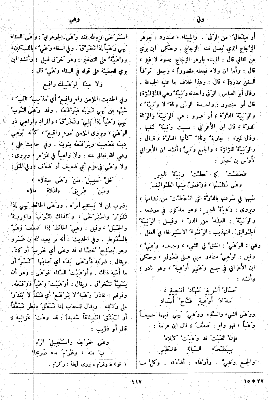 ووَهَى الشَّيْءُ والسِّقاء ووَهِيَ يَهِي فِيهِمَا جَمِيعًا وَهْياً، فَهُوَ واهٍ: ضَعُفَ؛ قَالَ ابْنُ هَرْمَةَ: