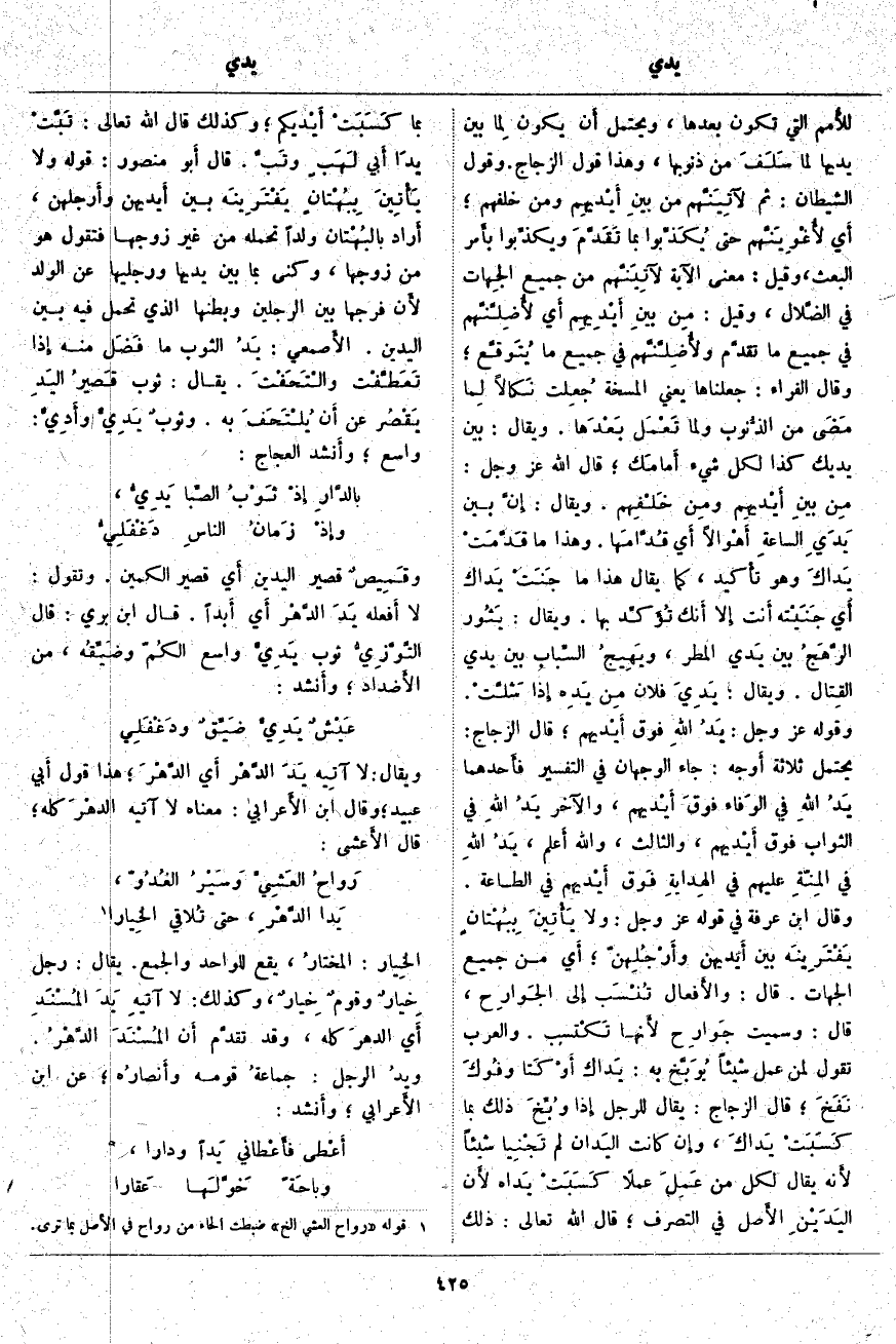 . وَيُقَالُ: إِنَّ بَيْنَ يَدَيِ السَّاعَةِ أَهْوالًا أَي قُدَّامَها. وَهَذَا مَا قَدَّمَتْ يَداكَ وَهُوَ تأْكيد، كَمَا يُقَالُ هَذَا مَا جَنَتْ يَداك أَي جَنَيْته أَنت إِلَّا أَنك تُؤَكِّد بِهَا. وَيُقَالُ: يَثُور الرَّهَجُ بَيْنَ يَدي الْمَطَرِ، ويَهِيجُ السِّباب بَيْنَ يَدَيِ القِتال. وَيُقَالُ: يَدِيَ فُلَانٍ مِن يَدِه إِذا شَلَّتْ. وَقَوْلُهُ عَزَّ وَجَلَّ: يَدُ اللَّهِ فَوْقَ أَيْدِيهِمْ