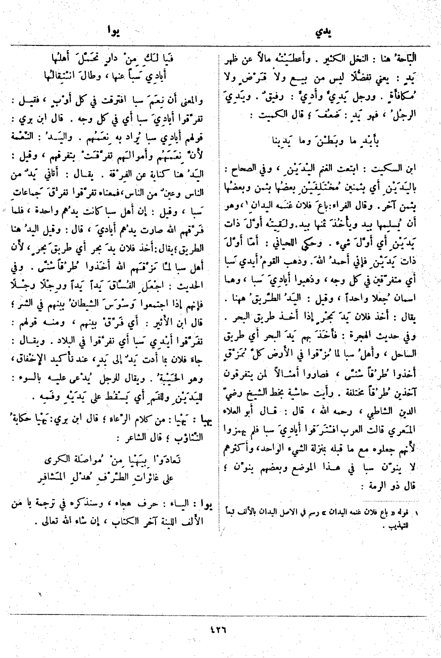 ابْنُ السِّكِّيتِ: ابْتَعْتُ الْغَنَمَ اليْدَيْنِ، وَفِي الصِّحَاحِ: باليَدَيْنِ أَي بِثَمَنَيْنِ مُخْتَلِفَيْنِ بعضُها بِثَمَنٍ وبعضُها بِثَمَنٍ آخَرَ. وَقَالَ الْفَرَّاءُ: باعَ فُلَانٌ غنَمه اليدانِ «1»، وَهُوَ أَن يُسلِمها بِيَدٍ ويأْخُذَ ثَمَنَهَا بِيَدٍ. ولَقِيتُه أَوَّلَ ذَاتِ يَدَيْنِ أَي أَوَّلَ شَيْءٍ. وَحَكَى اللِّحْيَانِيُّ: أَمّا أَوَّلَ ذَاتِ يَدَيْنِ فإِني أَحمدُ اللهَ. وَذَهَبَ القومُ أَيدي سَبا أَي مُتَفَرِّقِينَ فِي كُلِّ وَجْهٍ، وَذَهَبُوا أَيادِيَ سَبا، وَهُمَا اسْمَانِ جُعلا وَاحِدًا، وَقِيلَ: اليَدُ الطَّريقُ هاهنا. يُقَالُ: أَخذ فُلَانٌ يَدَ بَحْرٍ إِذا أَخذ طَرِيقَ الْبَحْرِ. وَفِي حَدِيثِ الْهِجْرَةِ: