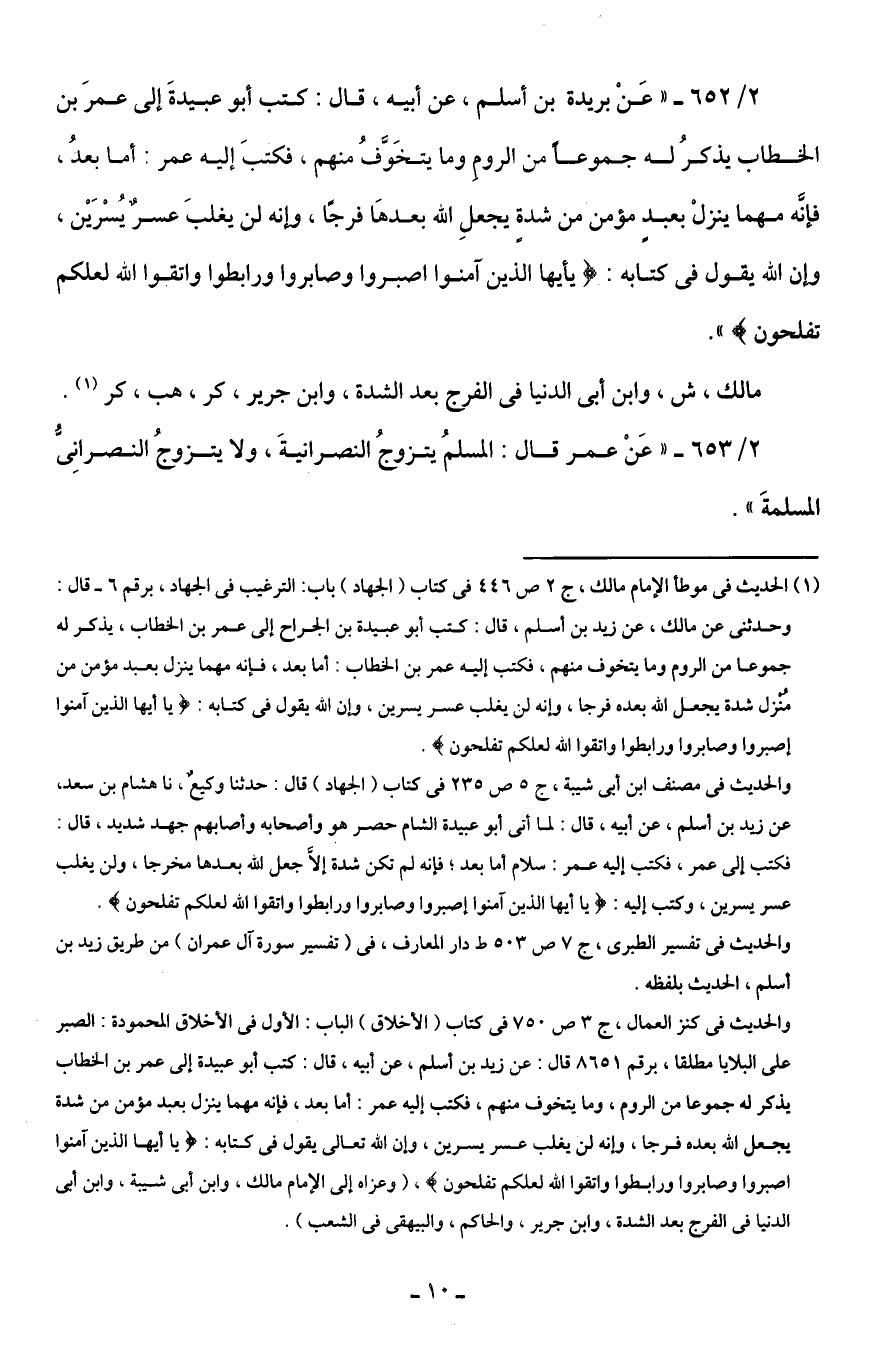 (¬1) الحديث في موطأ الإمام مالك، ج 2 ص 446 في كتاب (الجهاد) باب: الترغيب في الجهاد، برقم 6 - قال: وحدثنى عن مالك، عن زيد بن أسلم، قال: كتب أبو عبيدة بن الجراح إلى عمر بن الخطاب، يذكر له جموعا من الروم وما يتخوف منهم، فكتب إليه عمر بن الخطاب: أما بعد، فإنه مهما ينزل بعبد مؤمن من مُنْزل شدة يجعل الله بعده فرجا، وإنه لن يغلب عسر يسرين، وإن الله يقول في كتابه: {يَاأَيُّهَا الَّذِينَ آمَنُوا اصْبِرُوا وَصَابِرُوا وَرَابِطُوا وَاتَّقُوا اللَّهَ لَعَلَّكُمْ تُفْلِحُونَ}.