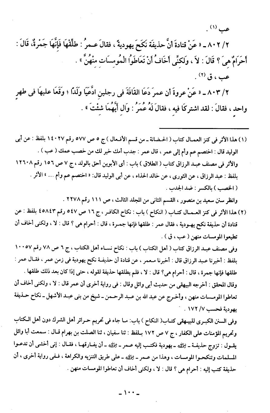 2/ 802 - "عَنْ قتادةَ أنَّ حذيفَة نَكَحَ يهوديةً، فقالَ عمرُ: طلِّقْهَا فَإِنَّهَا جَمْرةٌ، قَالَ: أَحَرَامٌ هِىَ؟ قَالَ: لَا، وَلكِنِّى أَخَافُ أَنْ تَعَاطَوا الْمُومِسَاتِ مِنْهُنَّ".