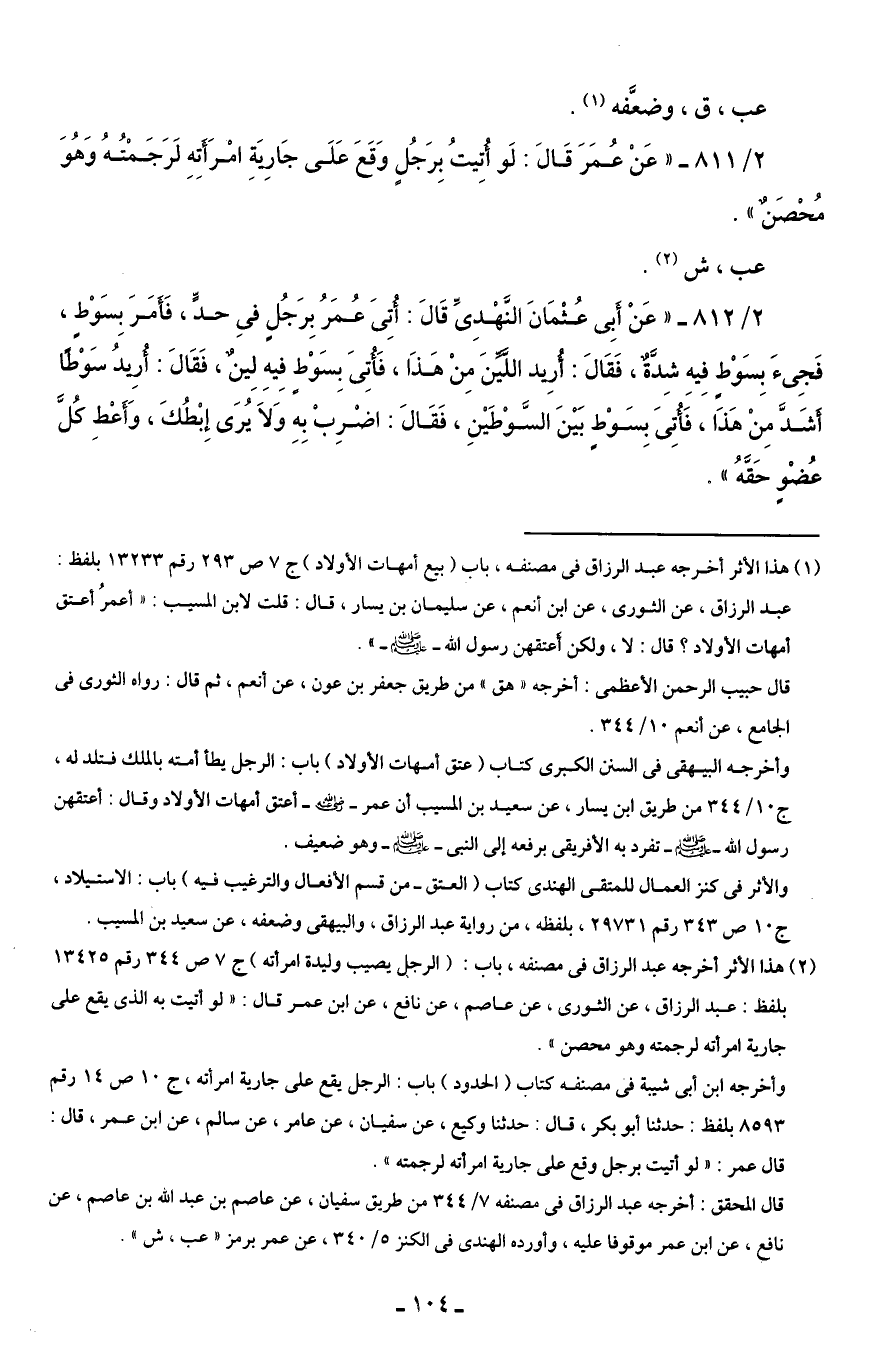 2/ 811 - "عَنْ عُمَرَ قَالَ: لَو أُتِيتُ بِرَجُلٍ وَقَعَ عَلَى جَارِيَةِ امْرَأَتِهِ لَرَجَمْتُهُ وَهُوَ مُحْصَنٌ".