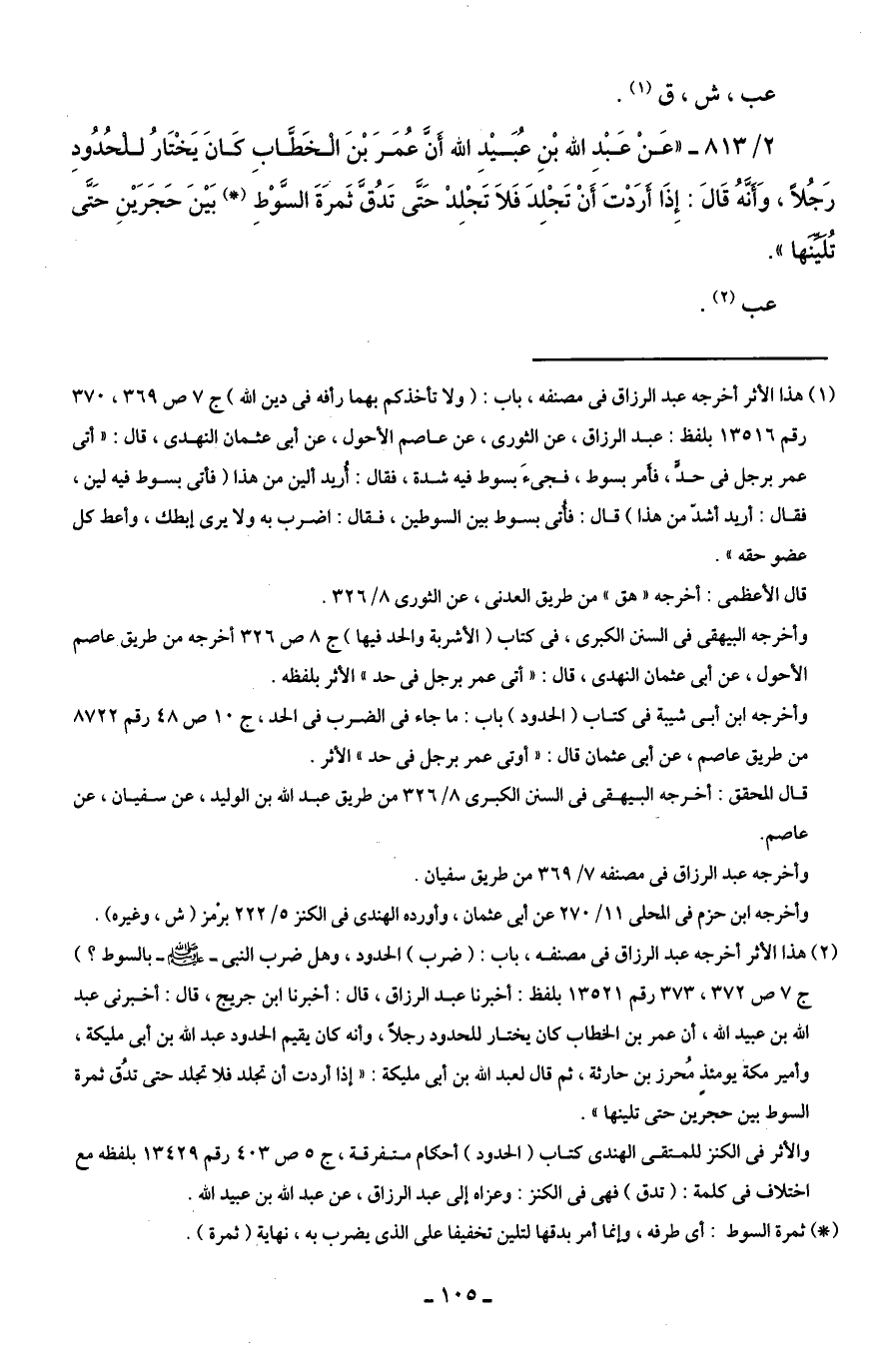 (¬1) هذا الأثر أخرجه عبد الرزاق في مصنفه، باب: (ولا تأخذكم بهما رأفة في دين الله) ج 7 ص 369، 370 رقم 13516 بلفظ: عبد الرزاق، عن الثورى، عن عاصم الأحول، عن أبى عثمان النهدى، قال: "أتى عمر برجل في حدًّ، فأَمر بسوط، فجئَ بسوط فيه شدة، فقال: أُريد ألين من هذا (فأتى بسوط فيه لين، فقال: أريد أشدّ من هذا) قال: فأُتى بسوط بين السوطين، فقال: اضرب به ولا يرى إبطك، وأعط كل عضو حقه".