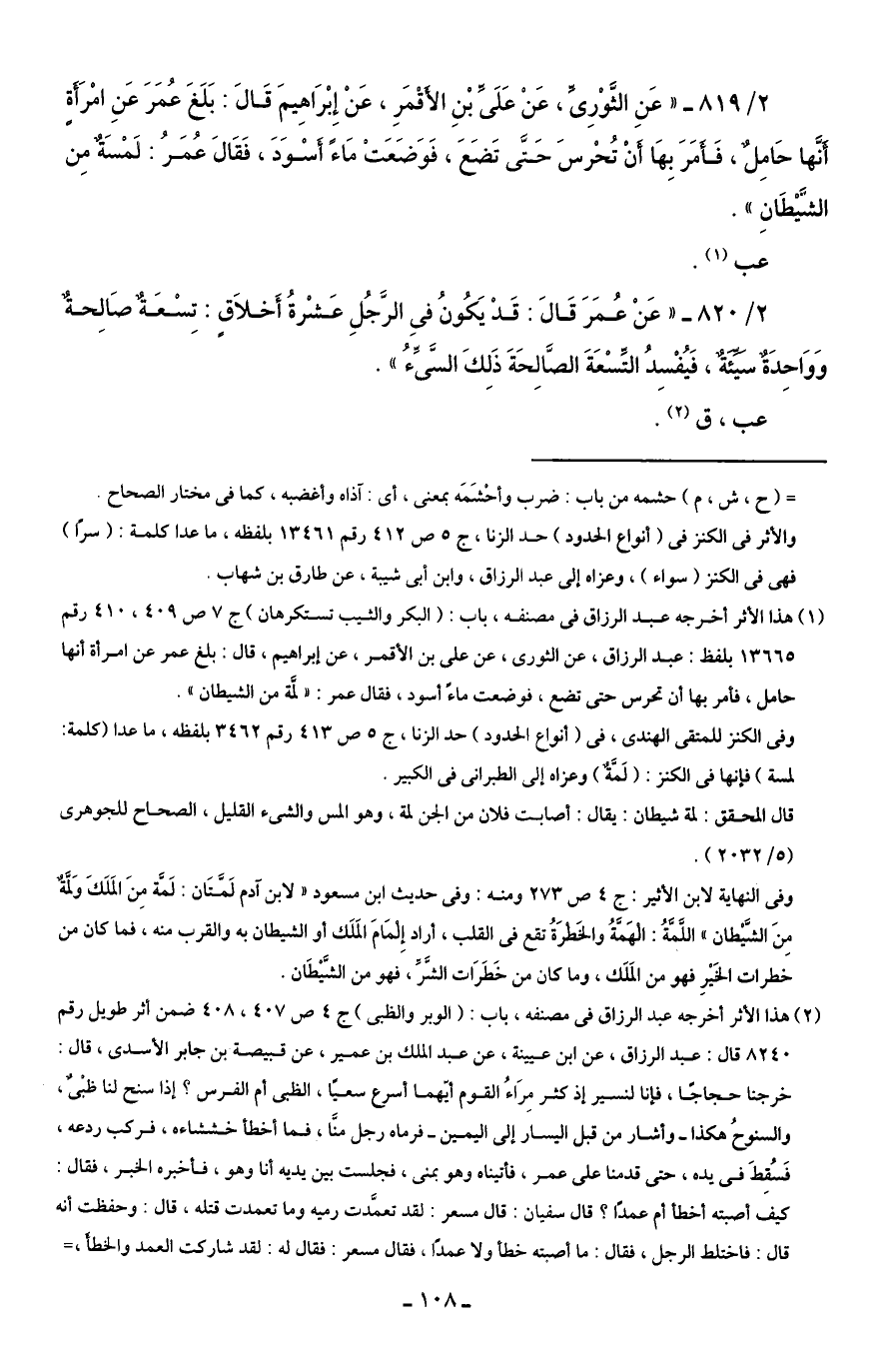 2/ 819 - "عَنِ الثَّوْرِىَّ، عَنْ عَلَىِّ بْنِ الأَقْمَرِ، عَنْ إِبْرَاهِيمَ قَالَ: بَلَغَ عُمَرَ عَنِ امْرَأَةٍ أَنَّها حَامِلٌ، فَأَمَرَ بِهَا أَنْ تُحْرسَ حَتَّى تَضَعَ، فَوَضَعَتْ مَاءً أَسْوَدَ، فَقَالَ عُمَرُ: لمْسَةٌ مِن الشَّيْطَانِ".