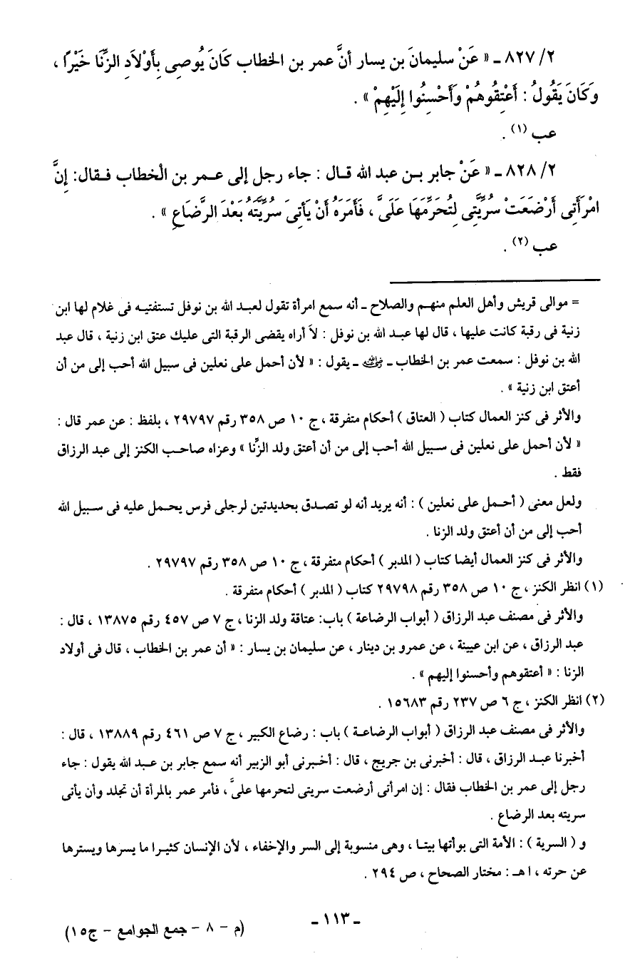 2/ 828 - "عَنْ جابر بن عبد الله قال: جاء رجل إلى عمر بن الخطاب فقال: إِنَّ امْرَأَتِى أَرْضَعَتْ سُرَّيَّتِى لِتُحَرَّمَهَا عَلَىَّ، فَأَمَرَهُ أَنْ يَأتِىَ سُرَّيَّتَهُ بَعْدَ الرَّضَاعِ".