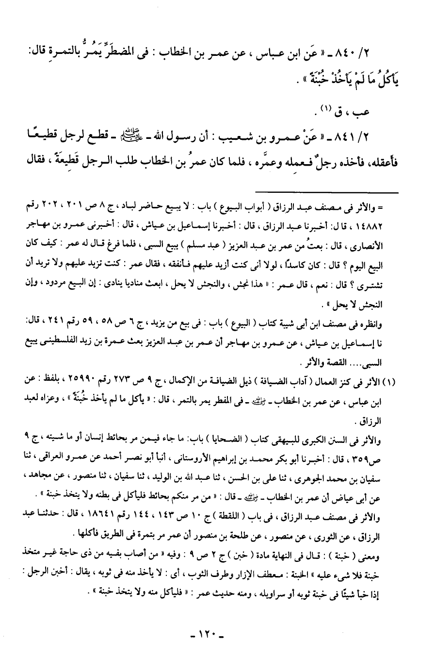 2/ 840 - "عَن ابن عباس، عن عمر بن الخطاب: في المضطَرَّ يَمُرُّ بالتمرةِ قال: يَأكُلُ مَا لَمْ يَأخُذْ خُبْنَةً".