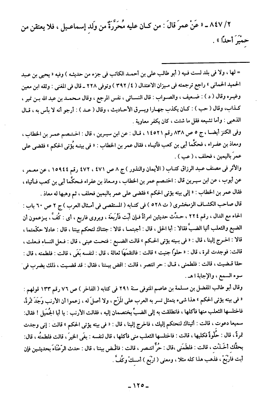 2/ 847 - "عَنْ عمرَ قالَ: من كان عليه مُحَرَّرَةٌ من وَلدِ إسماعيل، فلا يعتقن من حِمْيَرَ أحدًا".